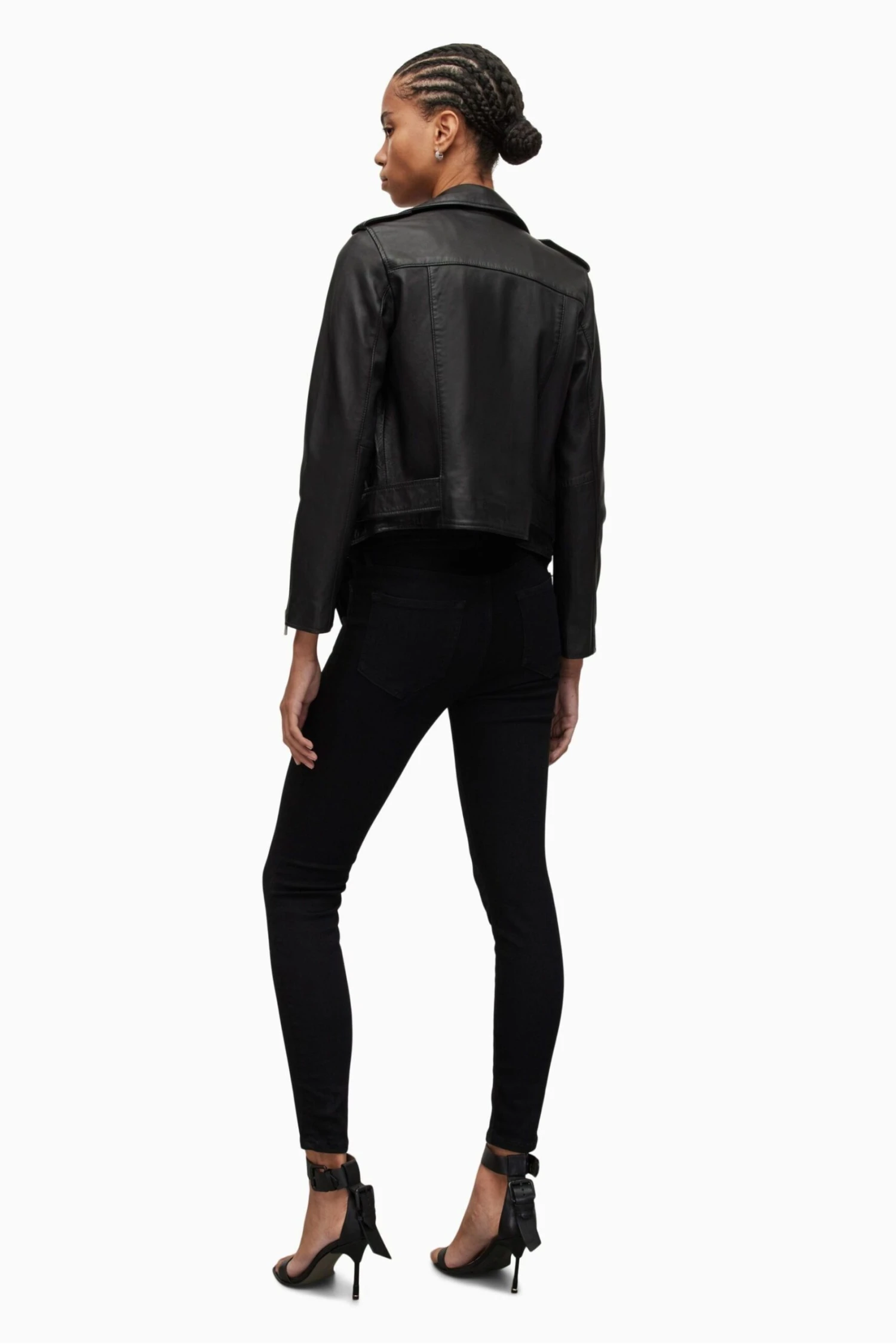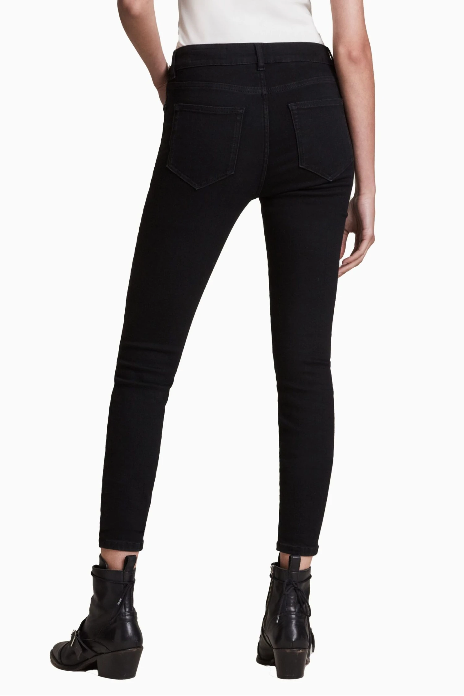 Featuring mid-rise, zip closure, vegan leather washer, five pockets, reinforced back pockets, reinforced belt loops, ultra-high elasticity, suitable for all body types and soft interior and exterior. Crafted with freedom of movement in mind. Low EIM score. ALLSAINTS cotton products support more sustainable cotton farming. Better Cotton is sourced via a system of Mass Balance.