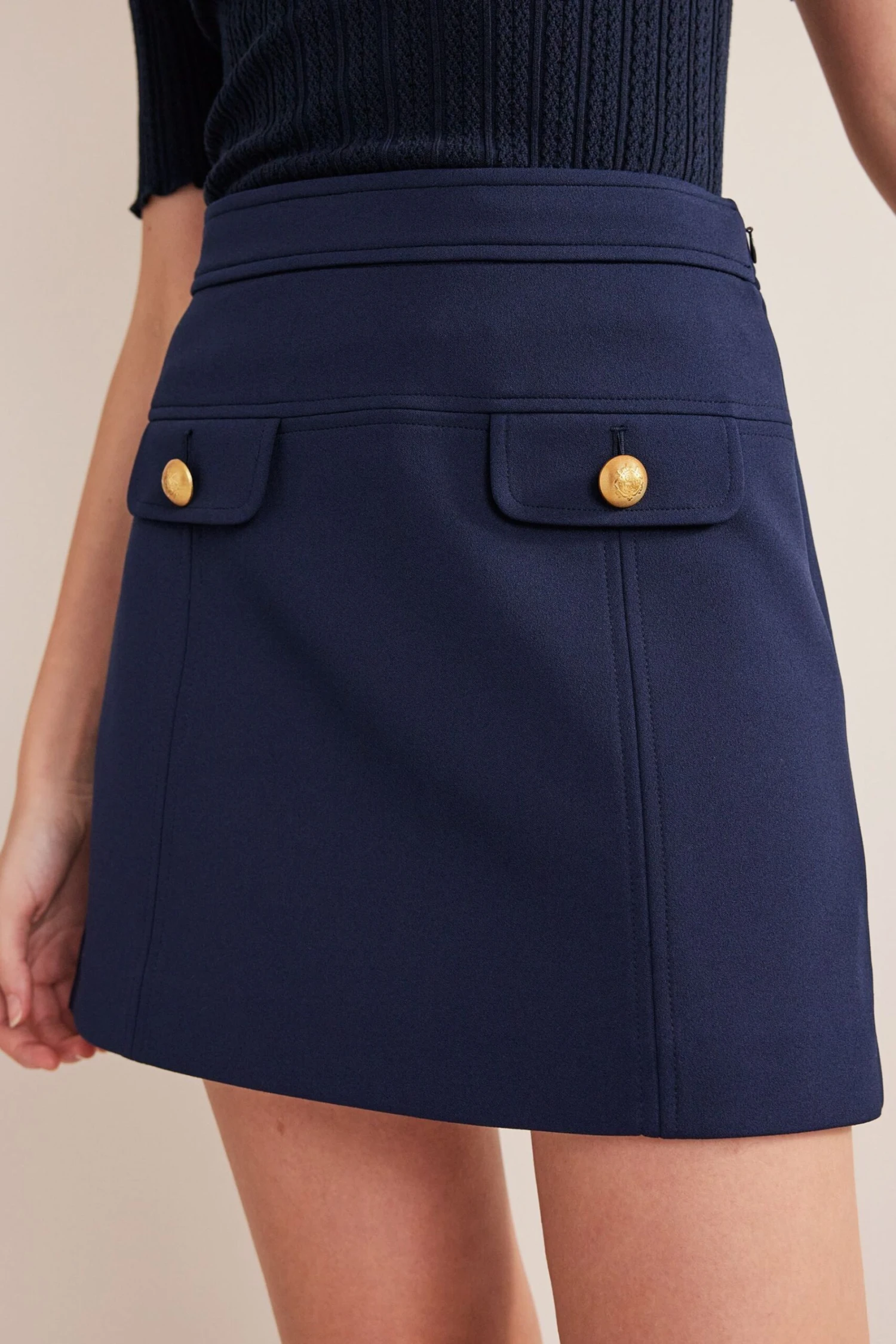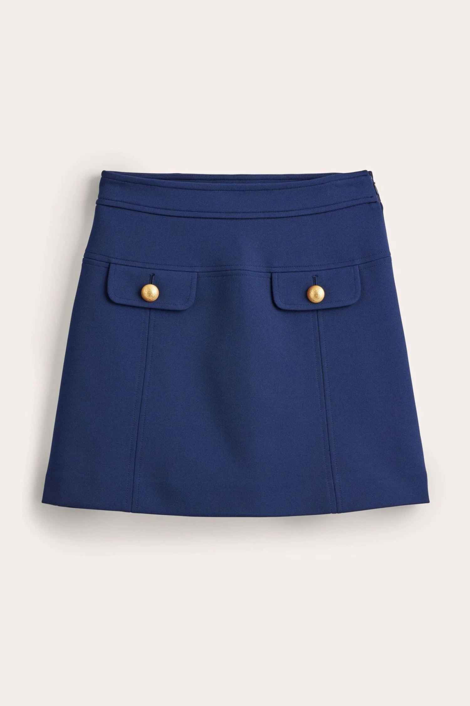 Two front pockets and a tailored A-line silhouette imbue this smart mini skirt with retro appeal.