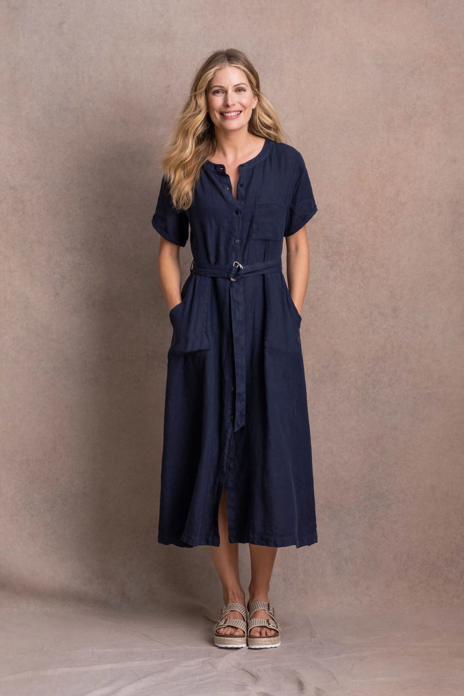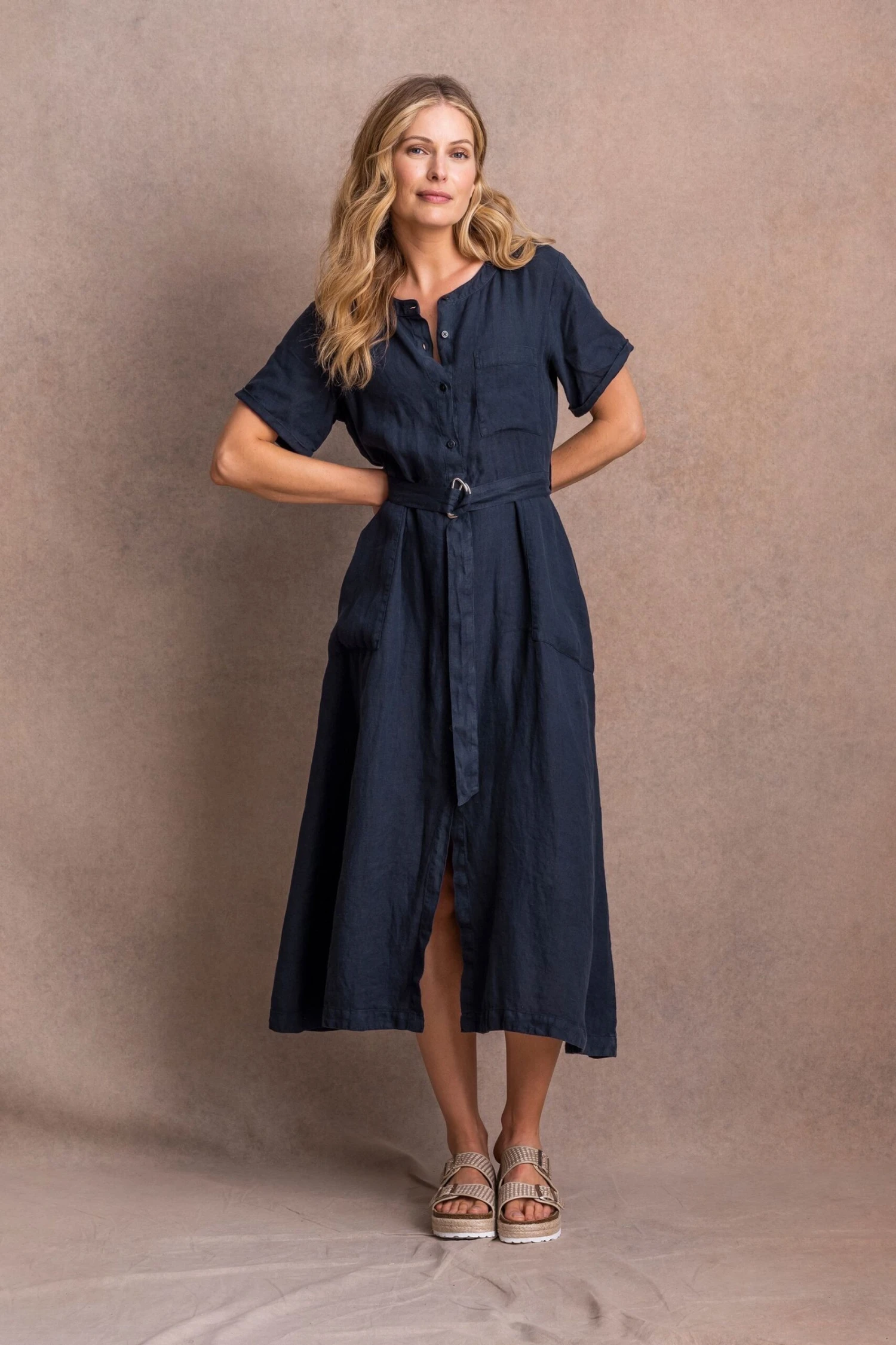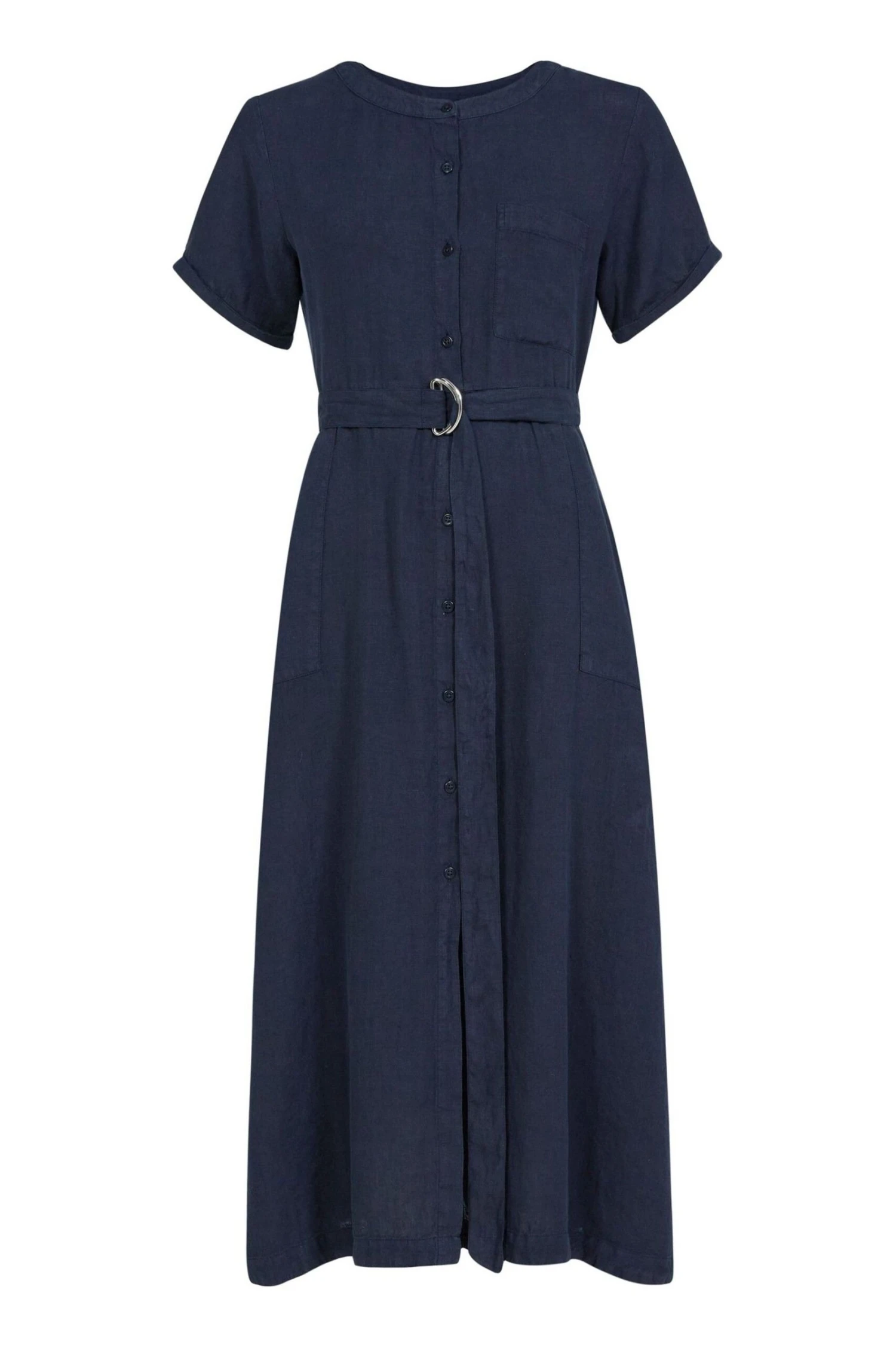 This button-through midi dress is light, airy and breathable, making it great for summer. A D-ring belt at the waist allows the dress to be adjusted to create your desired fit. Featuring a single chest pocket and two to the hip, turn-back cuffs on the sleeves, a crew neckline and Corozo buttons. It has been washed to give a tumbled, soft appearance, and its pull-on style makes it an effortless, classic garment. Due to the unique dying process, each garment may differ, creating a natural, beautiful and individual look.