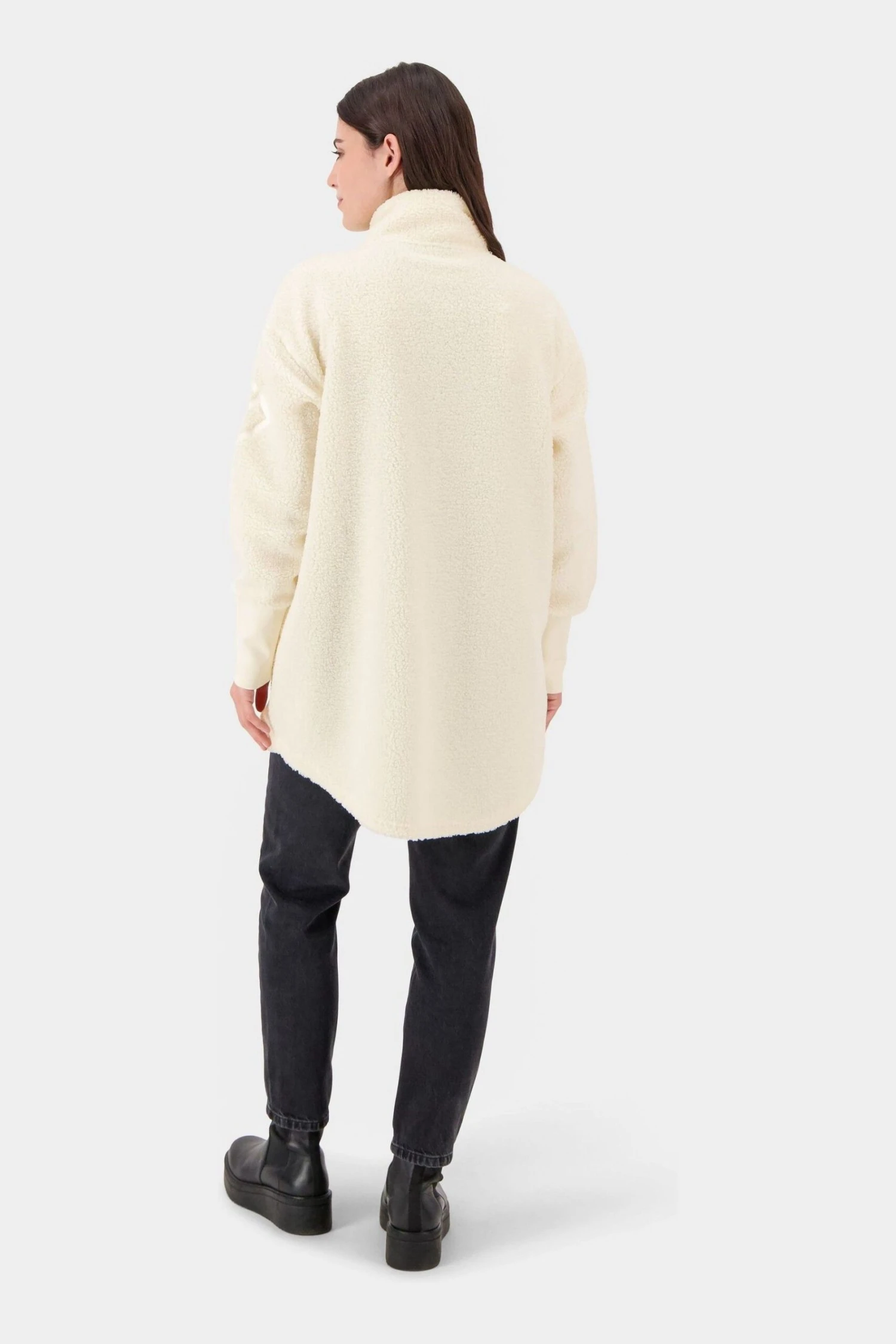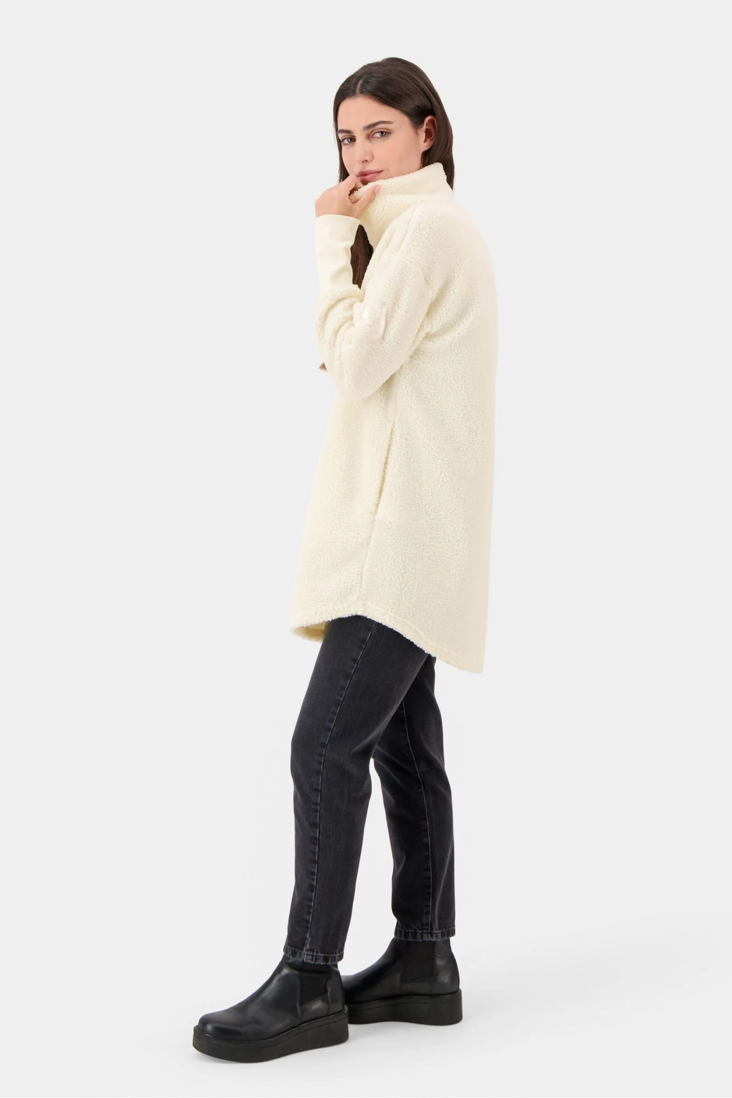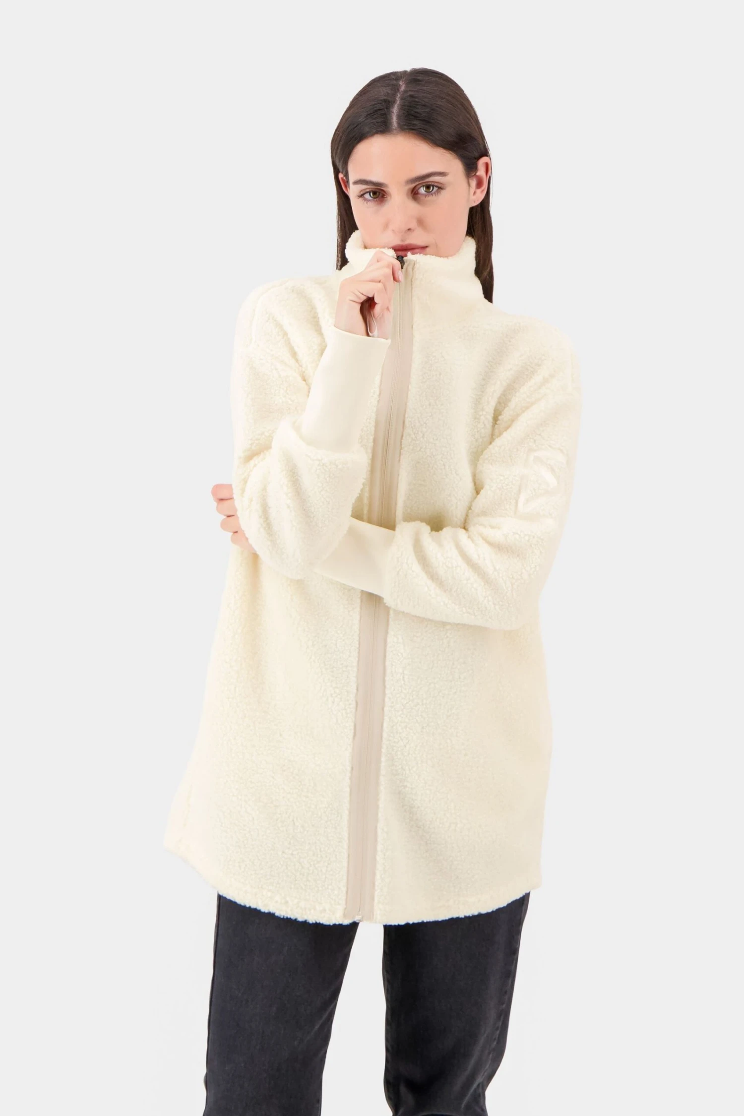 This cosy Sally jacket is a key piece in the everyday wardrobe. It is a warm fluffy pile jacket with cuffs and a soft collar. The jacket has minimal details, a simple design and a nice logo embroidery on the left sleeve. It has two pockets and it has a decorative front zipper with a shaped hem line.