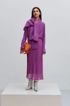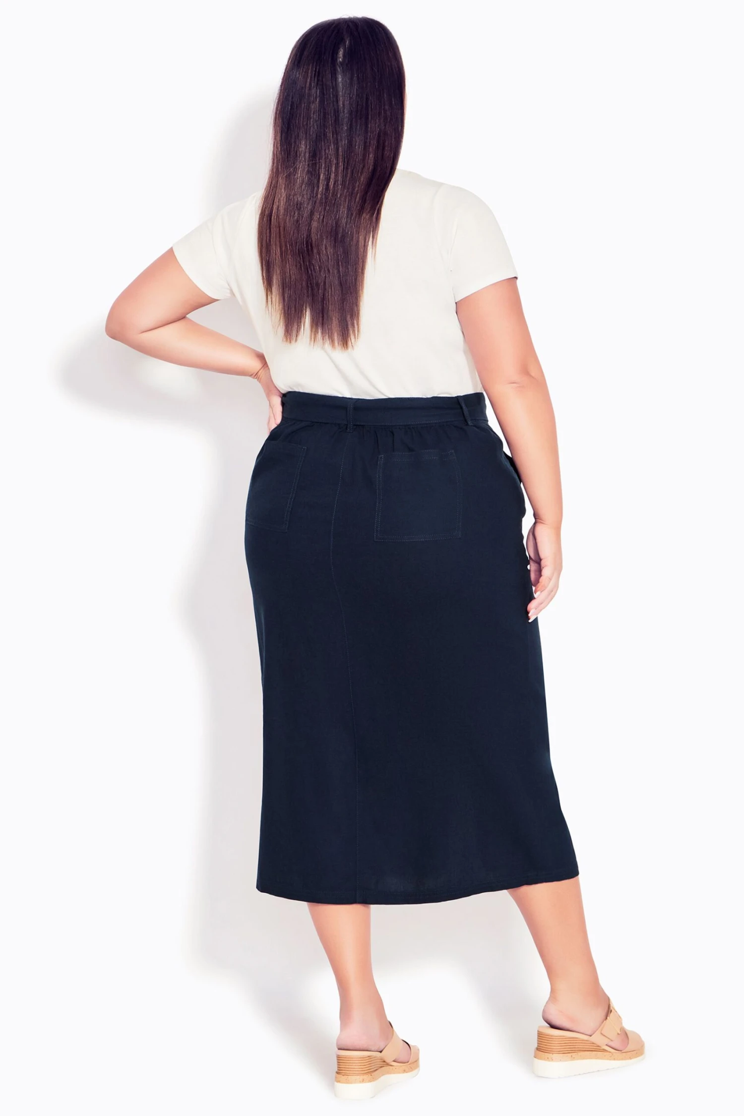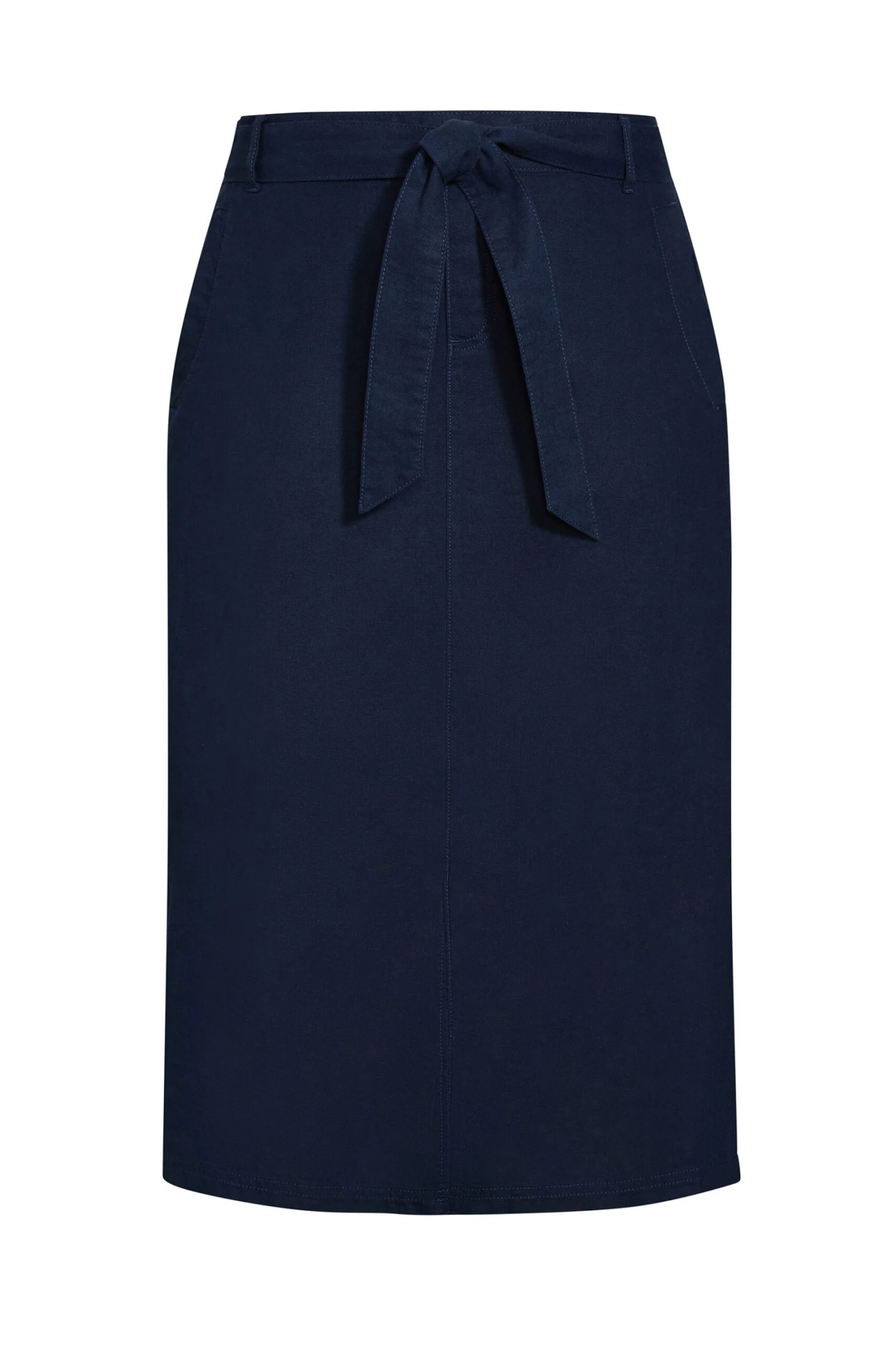 A staple style in your daily wardrobe, slip into the easy finish of the Linen Blend Skirt. The tie waist belt and elasticated detail add comfort to a relaxed midi silhouette, finished with a sweet split front. Key Features Include: Elasticated waistband to back with self tie. Faux single button and fly closure design. Four functional pockets. Midi length. Front split detail A relaxed tee keeps this midi skirt casual.