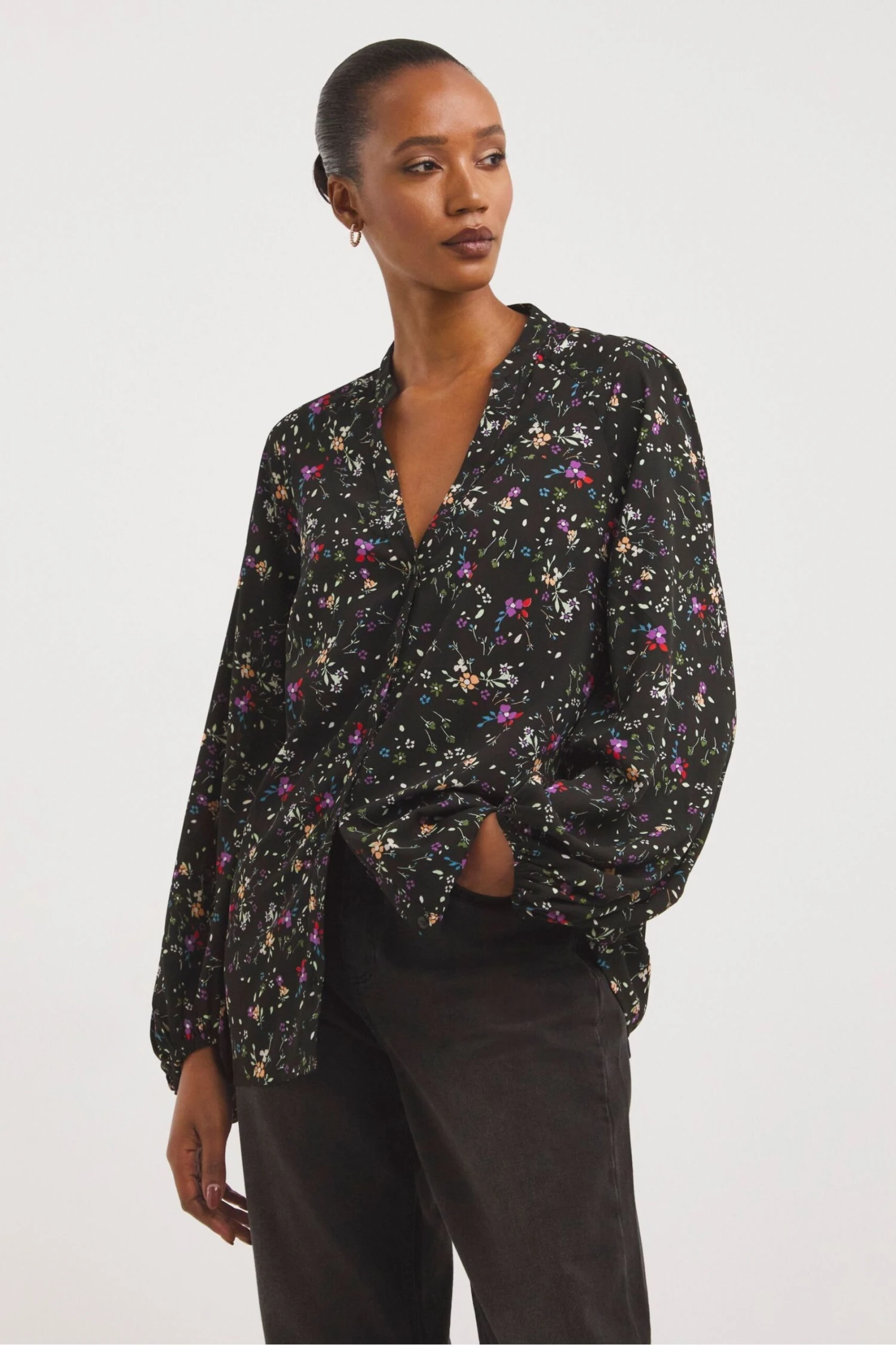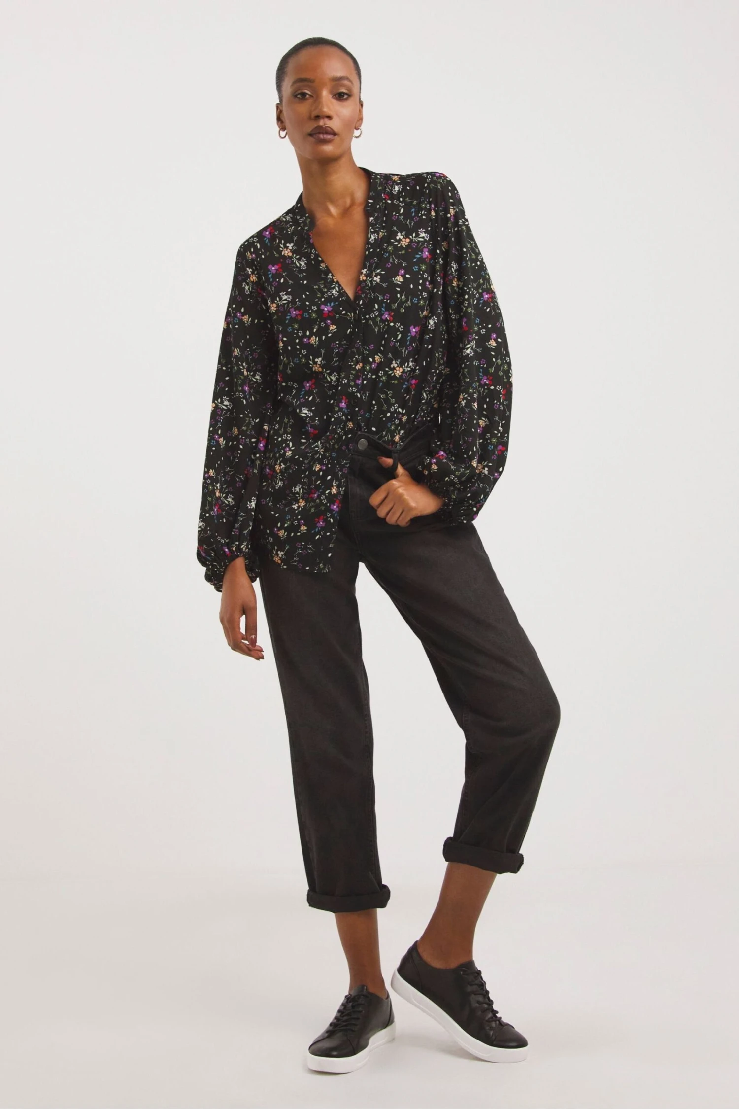 JD Williams Floral Print Volume Sleeve Black Blouse