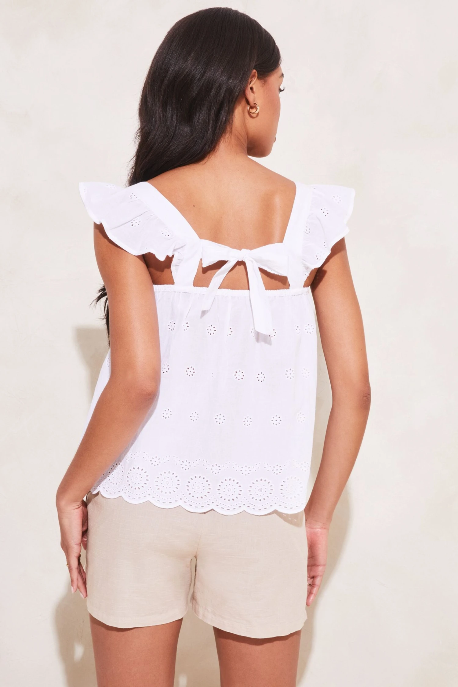 A gorgeous broderie cami with a tie back detail and a scallop hem. Model wears size UK 8.