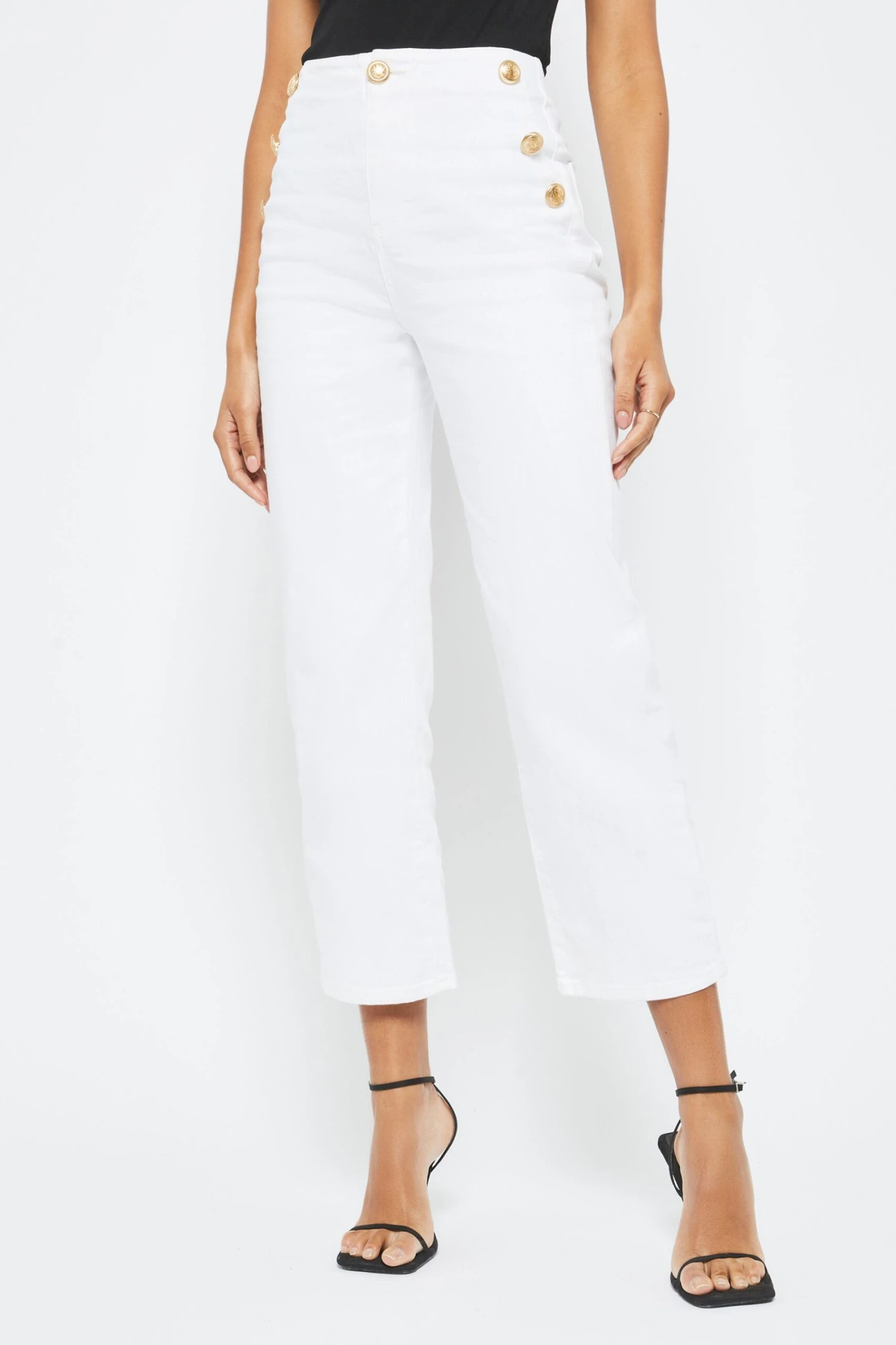 Military button detail crop wide leg jeans with a slight stretch. Model is wearing a size UK 8.