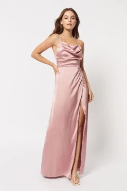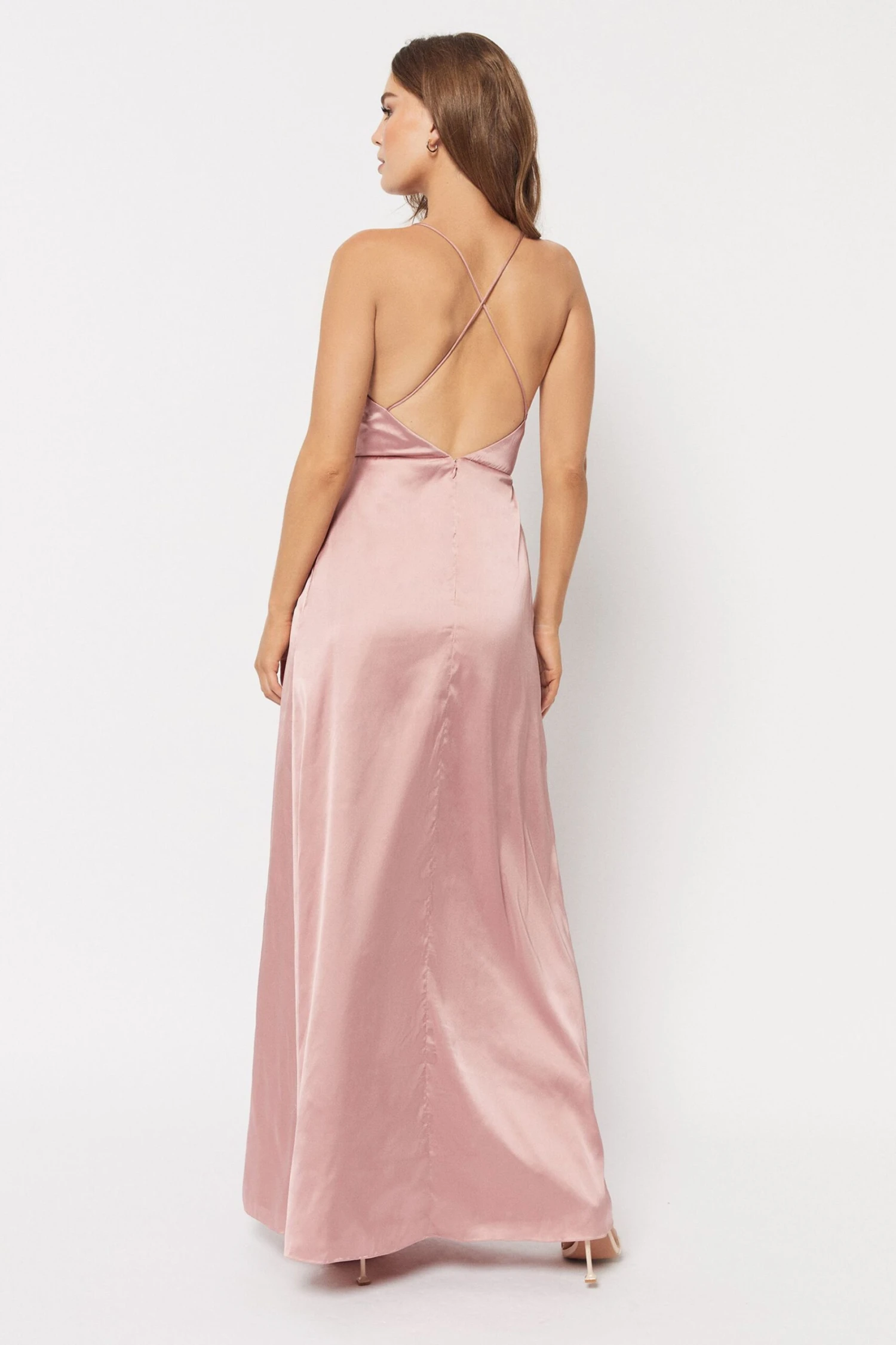 If you’re after and effortless dress with a sophisticated silhouette, look no further than this dress. Imagined with a cowl neckline and open back, the strappy bodice boasts elegance and comfort. Split maxi skirt is achieved by a simple wrap design and elevated by the gentle gathering on the waist. Wear this minimalistic piece with nude, heeled sandals, and silver accessories.