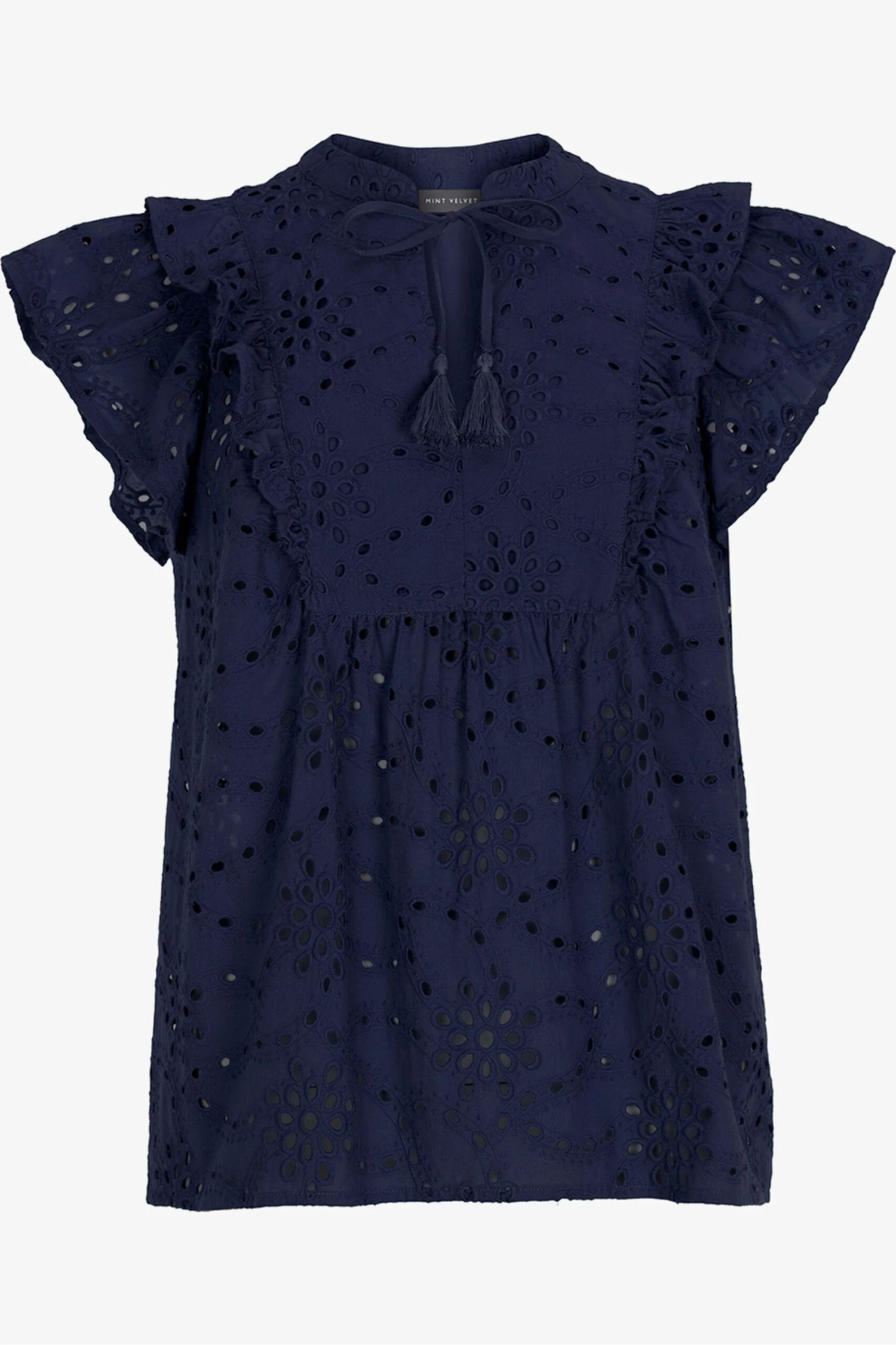 Broderie anglais gets a contemporary upgrade with this intricate navy top – we love the tie at the neck, giving this a boho vibe.