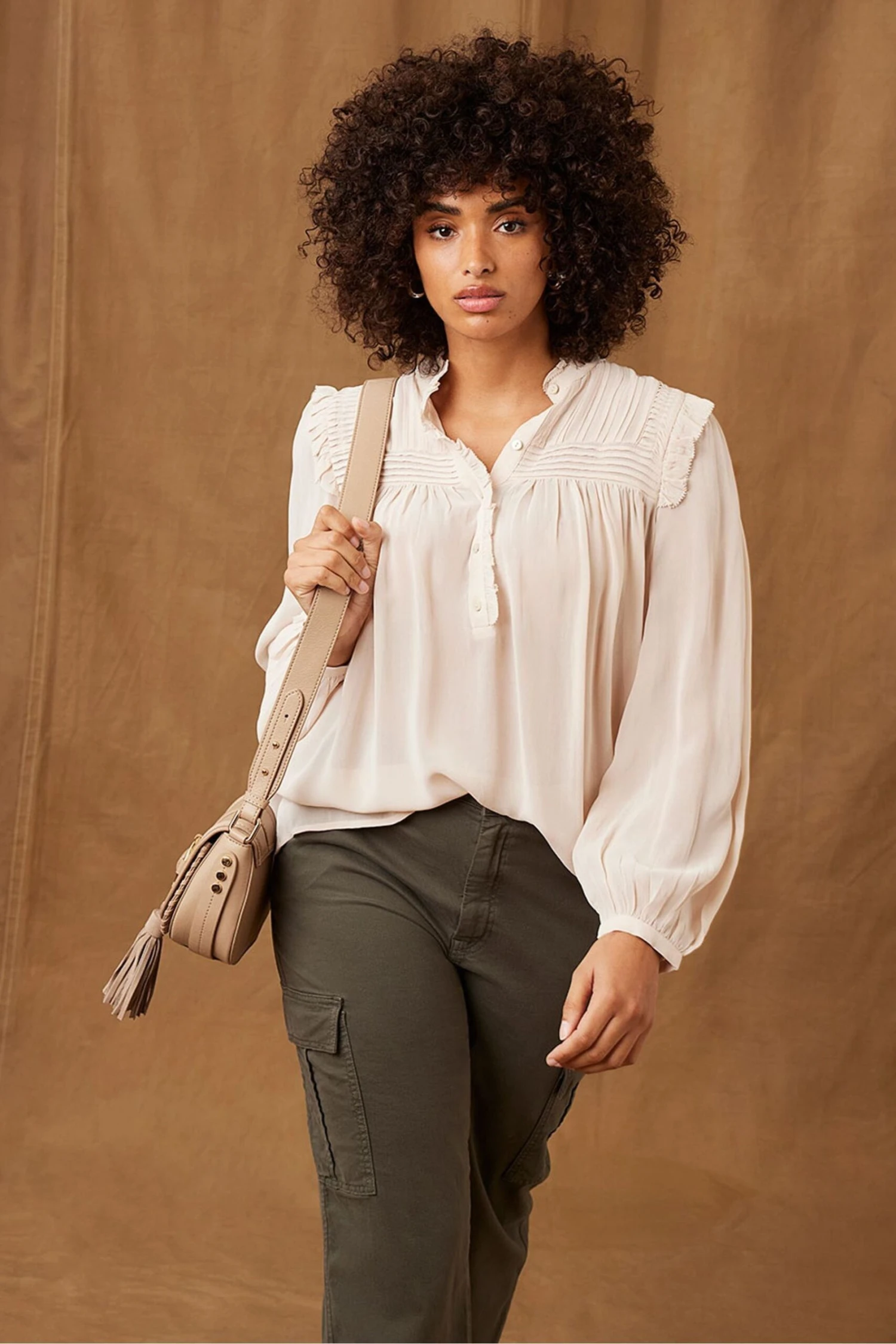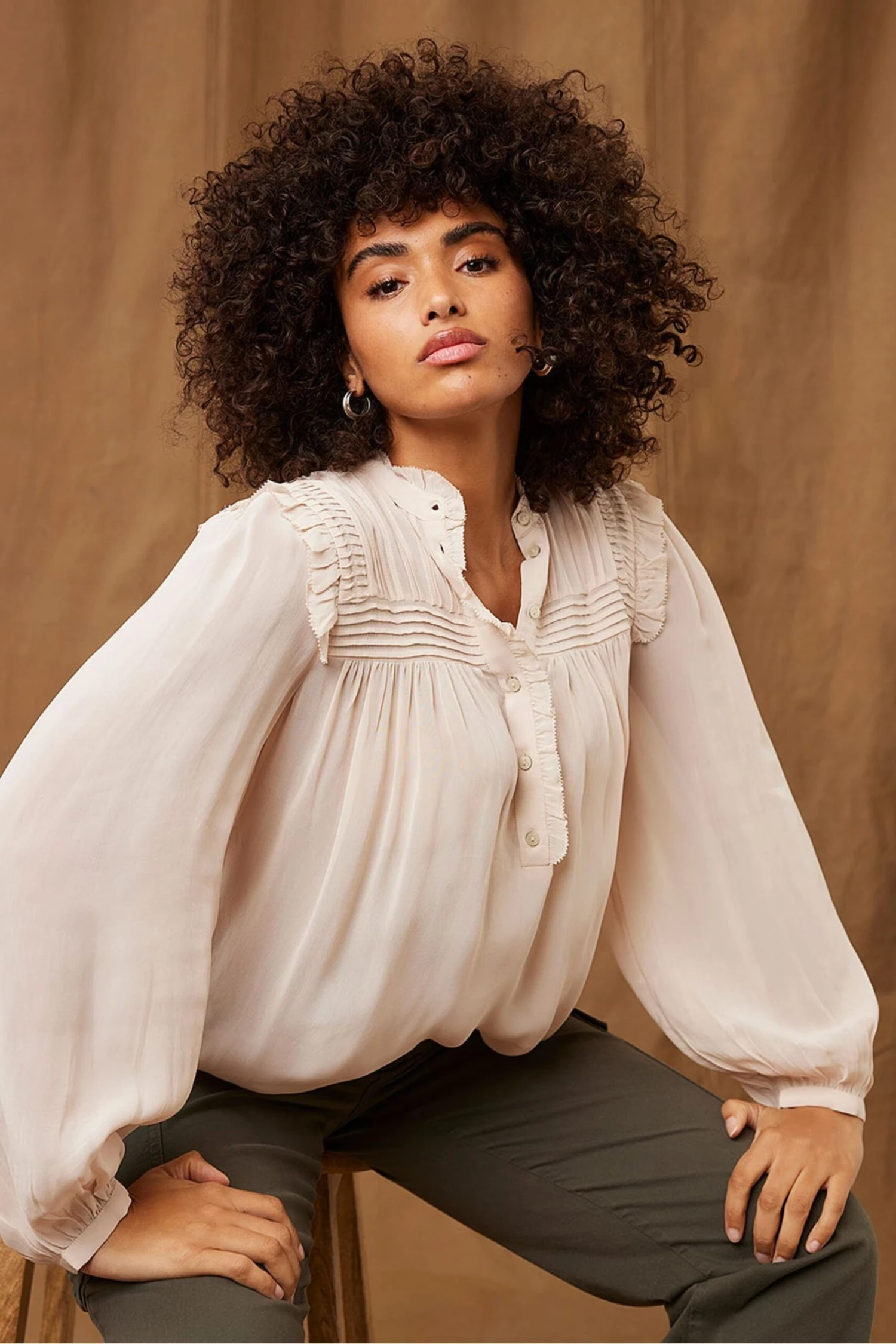 Style this elegant cream blouse with chunky heels and denim for a Relaxed Glamour look.