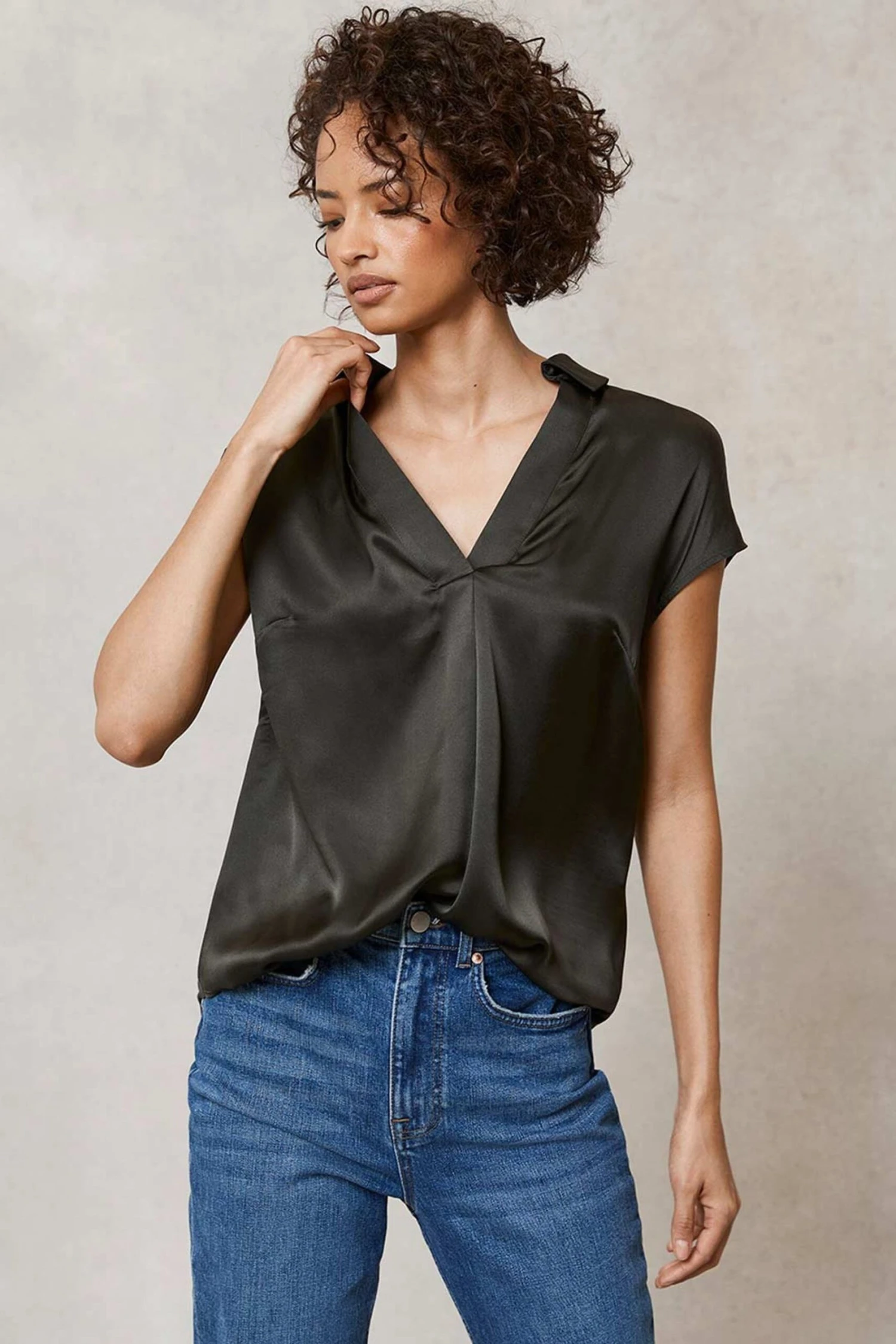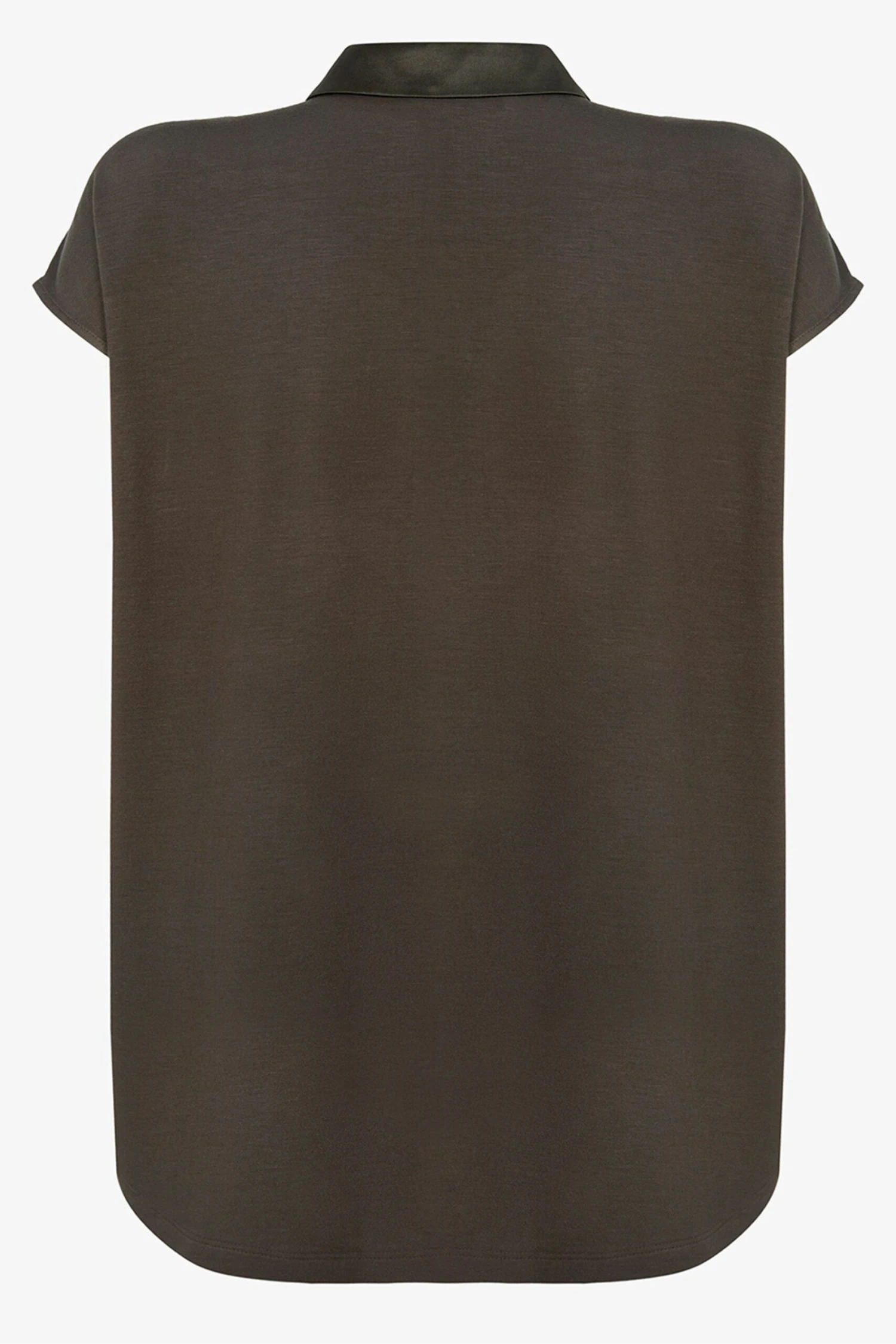 This khaki shirt combines a luxurious silk-satin front with their finest jersey on the back for the perfect blend of comfort and style. The loose-fitting silhouette is framed by a classic collar with a V neckline. It’s designed to add a touch of effortless glamour to your outfits – wear yours with everyday jeans and trousers alike.