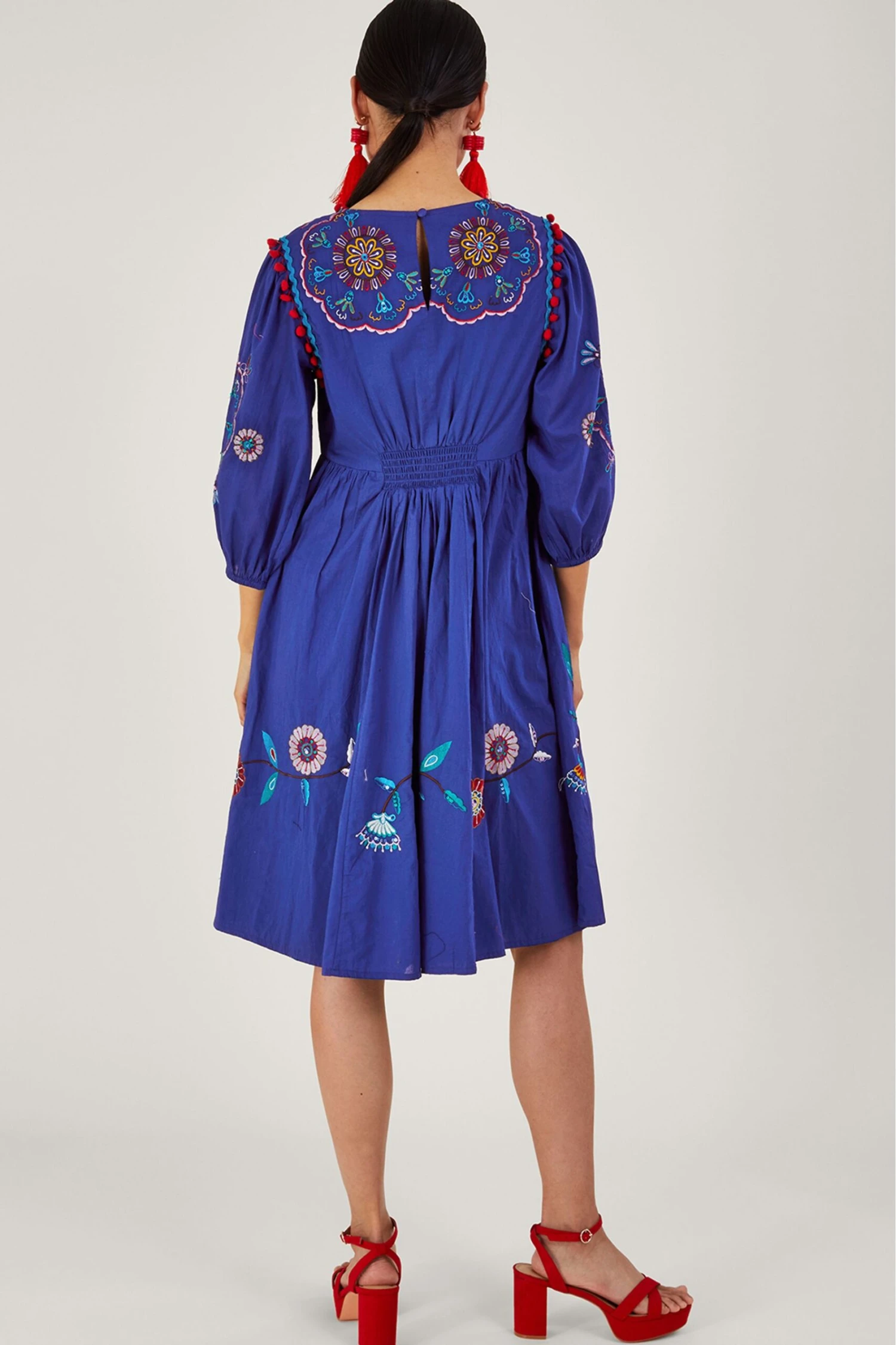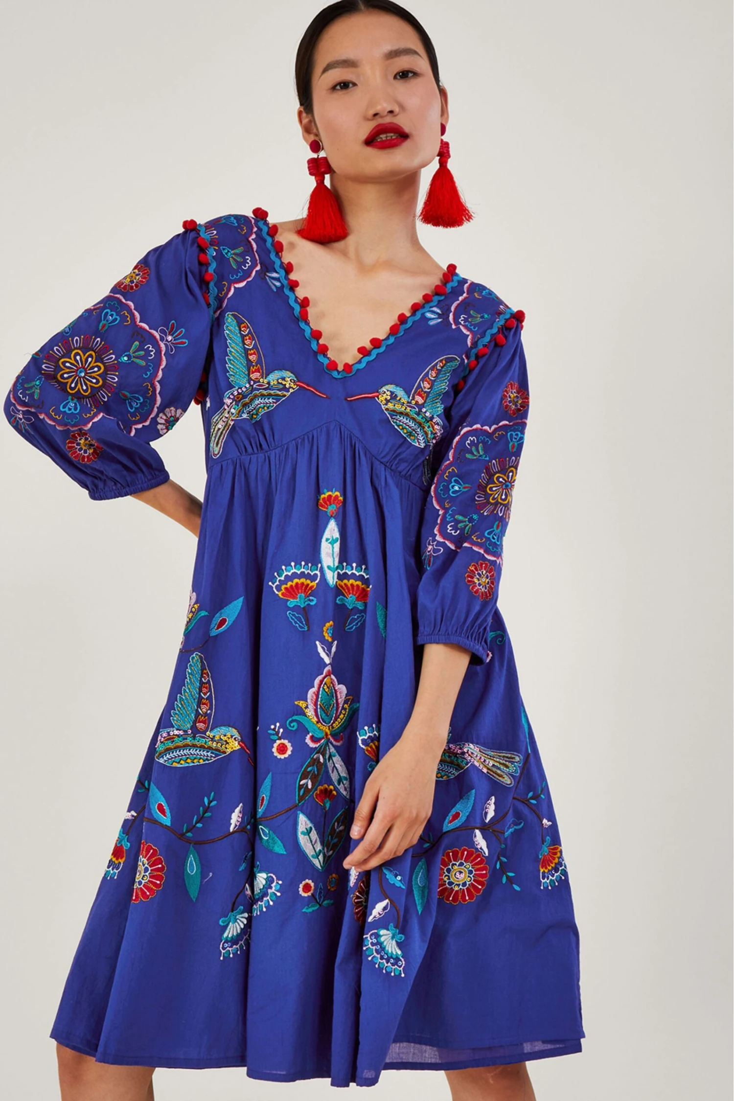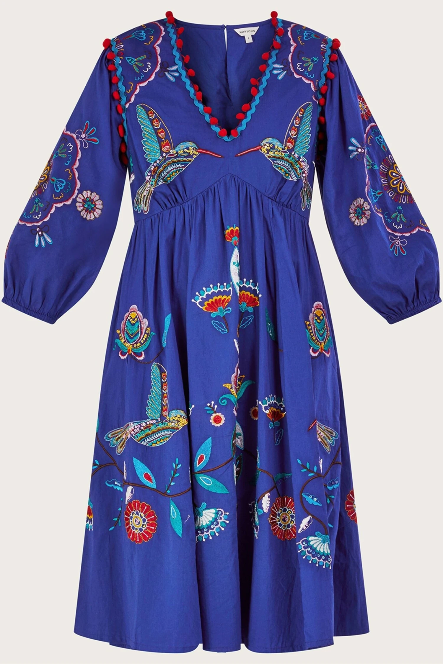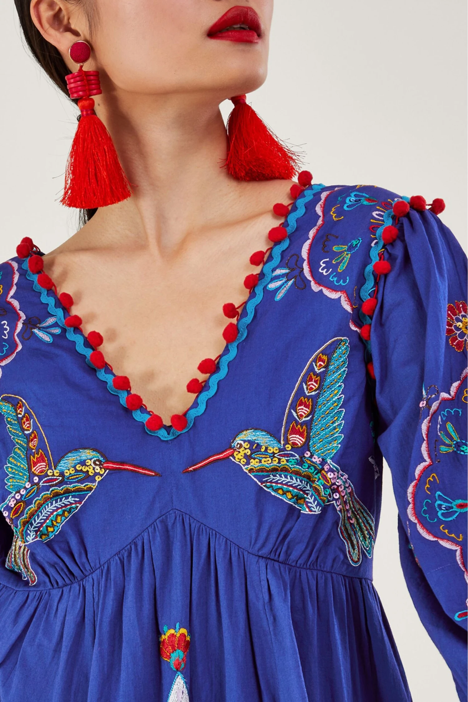 Watch hummingbirds in flight and florals bloom through this dress, a special piece for summertime. The relaxed bodice boasts blouson sleeves and a pom-pom detail neckline that runs through to the reverse, falling into a smock-style skirt for an easy breezy fit. As part of the journey to make our clothes kinder to the world around us, this item was made using more sustainable raw materials, such as organic cotton, recycled polyester and viscose from responsibly grown forests.