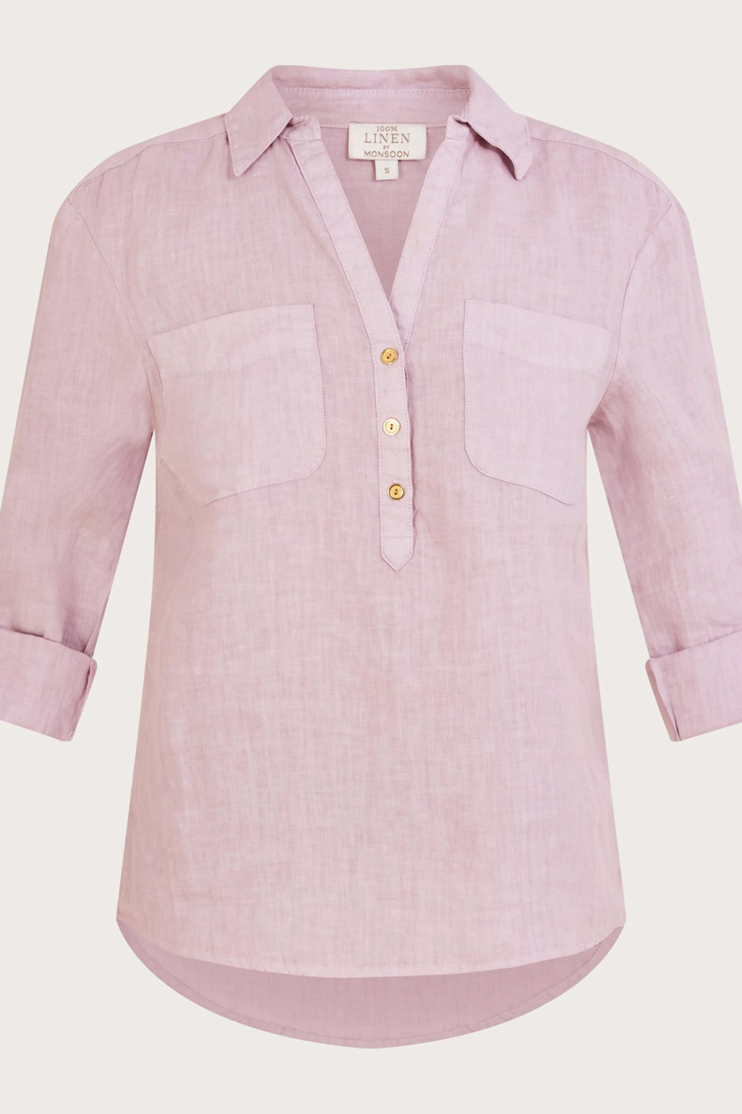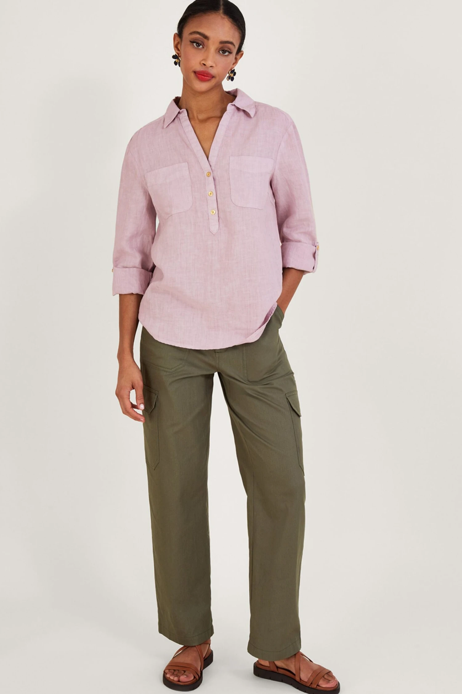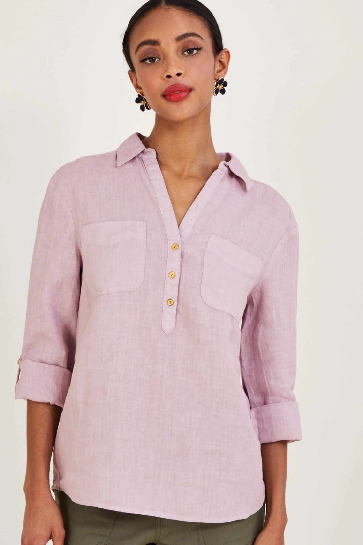 A piece you can throw on with anything, this laidback shirt is designed in airy linen. With a collared Y-neckline, it features button detailing and pockets over the chest, whilst the sleeves are finished with roll-up cuff buttons for a 3/4 length option.