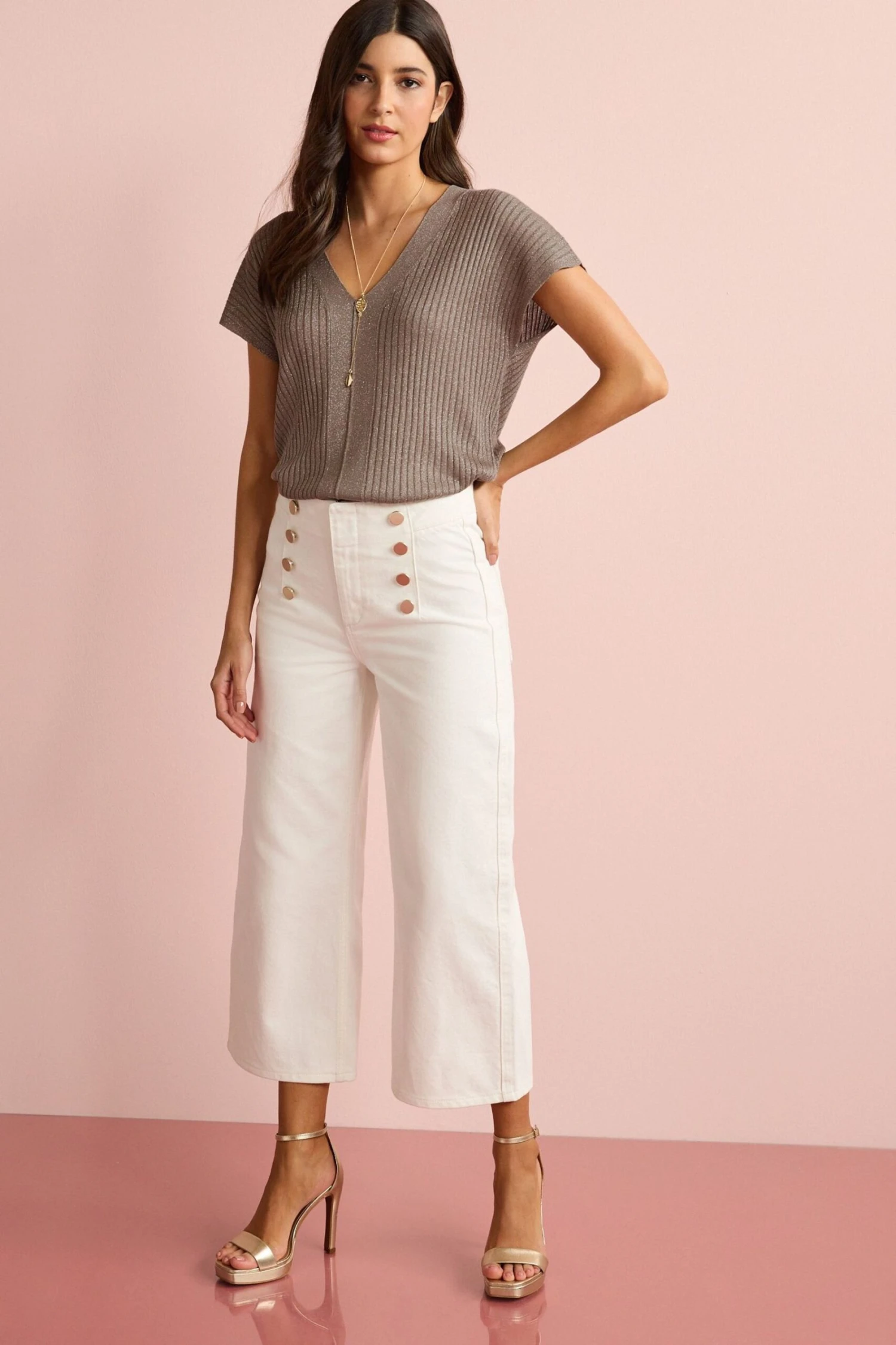 Effortless and elegant, our white button detail wide leg jeans are a wardrobe must-have. Made from classic cotton denim, they are cropped at the ankle so you can make a real top to toe style statement. The double button detail on the front seams is a nice touch, perfect for tucking in your favourite top and wearing with a chunky chain necklace.