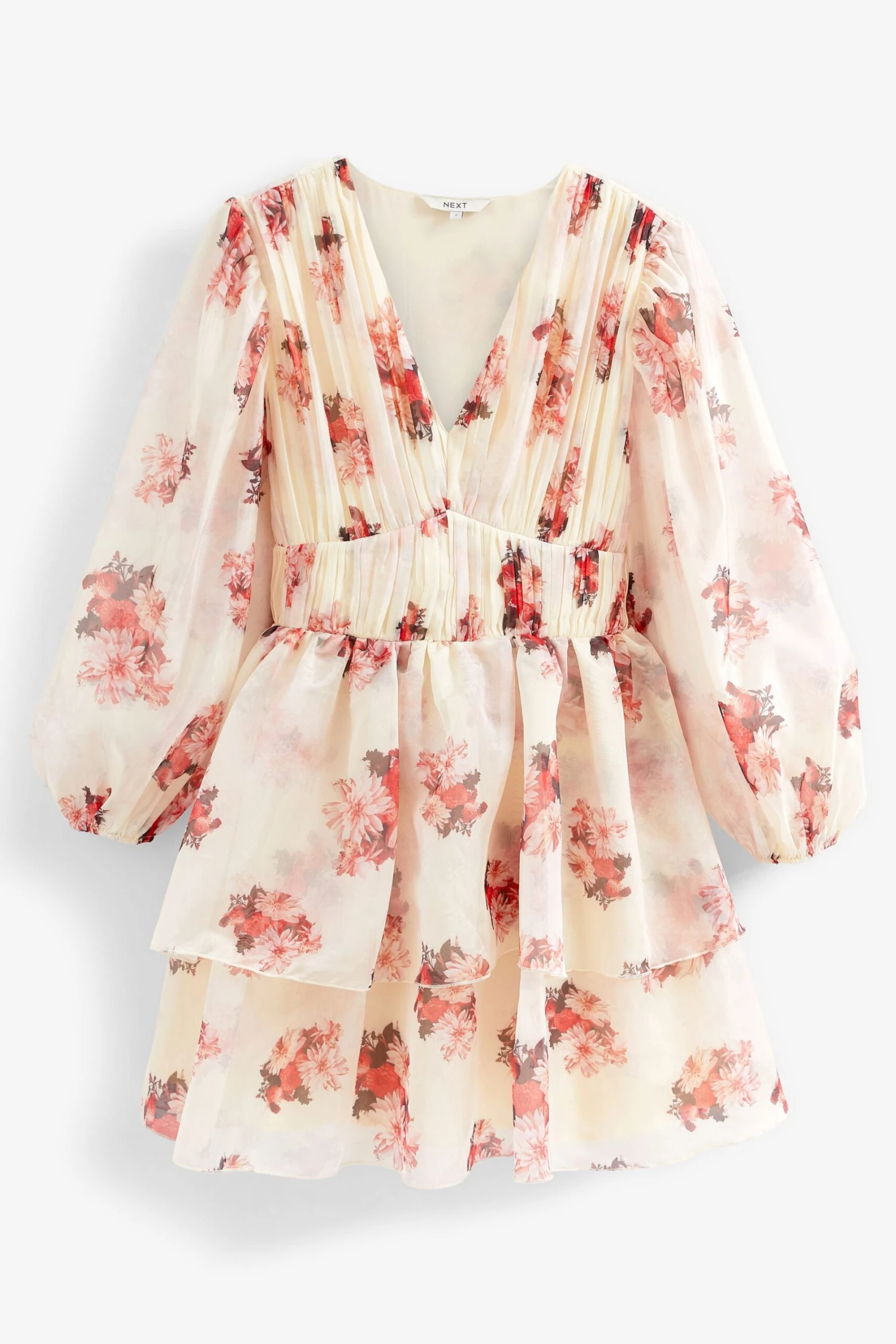Next Cream Floral Print Long Sleeve Tiered Mini Dress