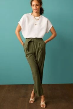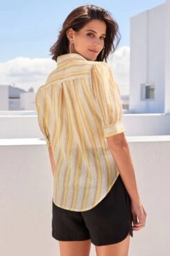 An easy breezy sunshine style, our viscose/linen blend top is sure to be a popular choice in your warm weather rotation. Designed with a V-neck, button through fastening and ruffle shoulder detailing. Team with jeans and sandals for a comfortable casual look.