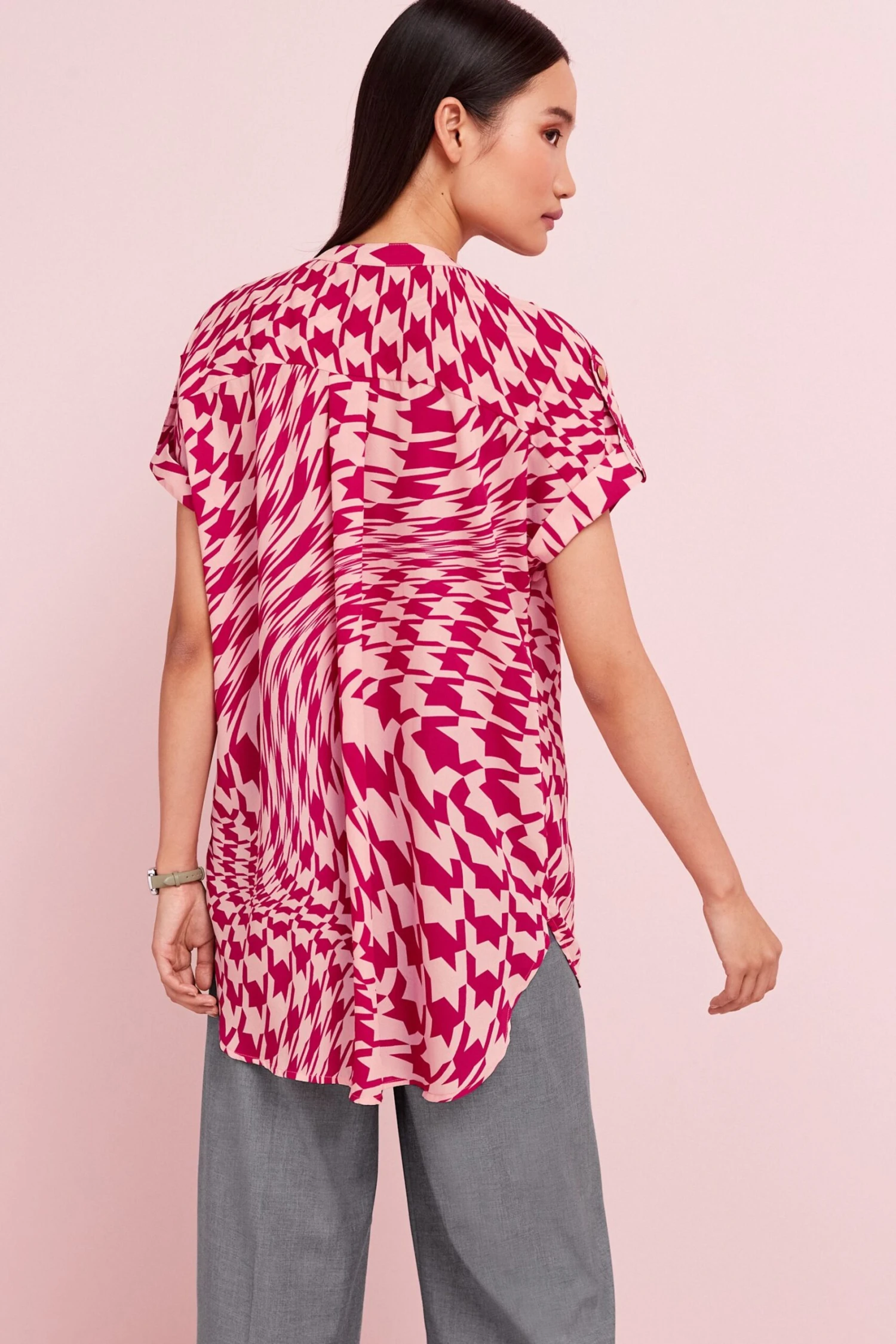 Designed with a sleek silhouette, our head-turning pink/red print overhead longline short-sleeve blouse is a wardrobe staple with attitude. So easy to pair with your favourite jeans or a tailored trouser for a more polished look.