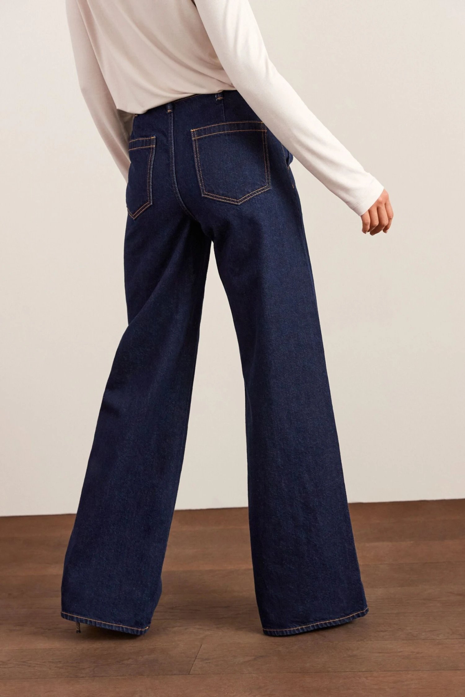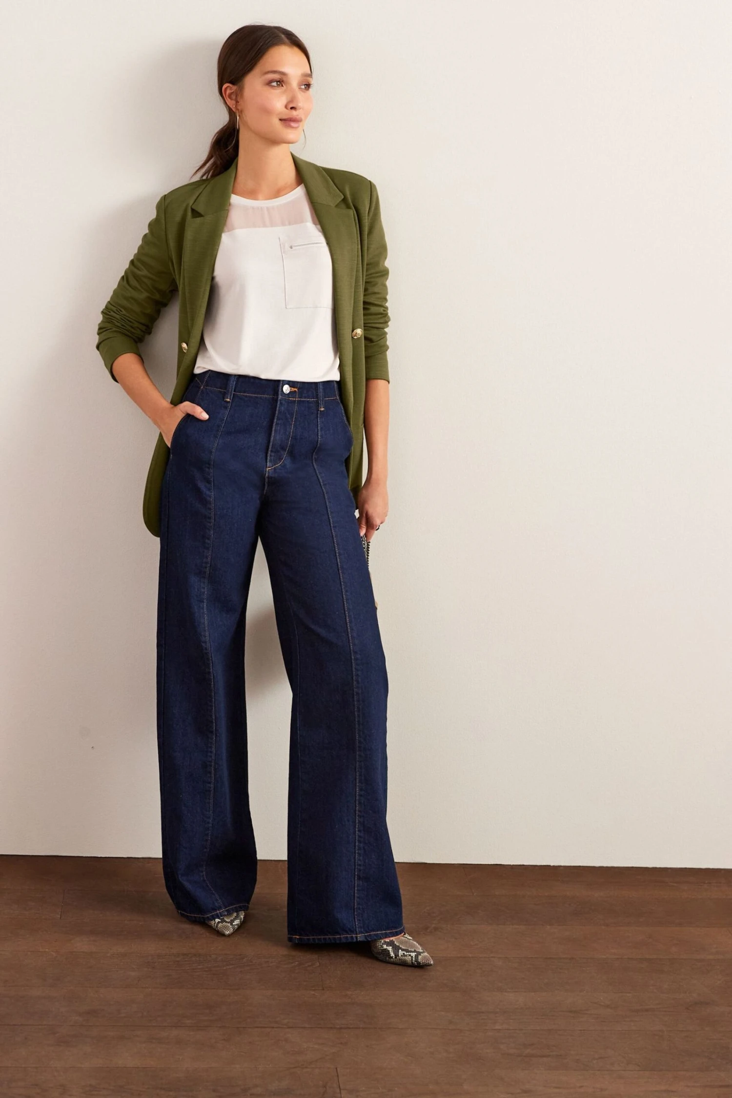 The about-to-be-big silhouette of the season is right under your nose. Our rinse blue tailored wide leg jeans will instantly make you feel polished.