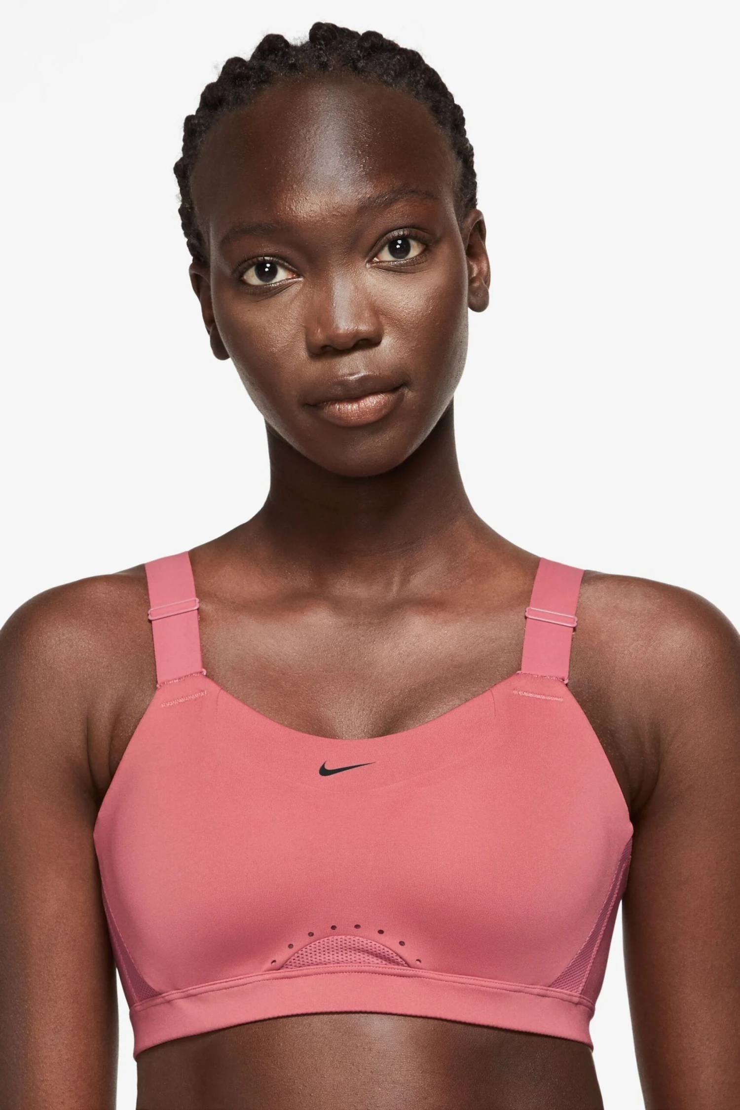 FEEL CONFIDENT IN YOUR SUPPORT. The Nike Alpha Sports Bra gives you our highest level of support with a compressive feel and minimal bounce for a secure fit. Engineered foam pads provide shaping, and it adjusts in the back so you can feel comfortably contained – yet still able to breathe.