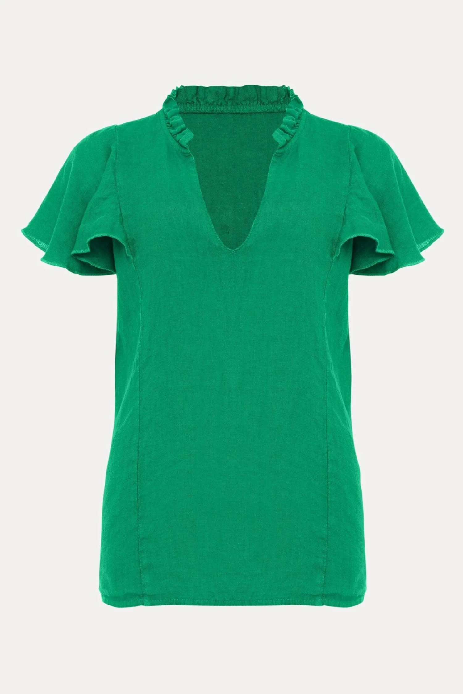 Our 100% linen top is a wardrobe essential. Designed with a V-neckline and short, frill sleeves our colour-pop green blouse features flattering front seam detailing. This is a must-pack for your next holiday. Part of our Sustainably Sourced Collection. With no synthetic inputs, linen is a natural fibre with low environmental impact.