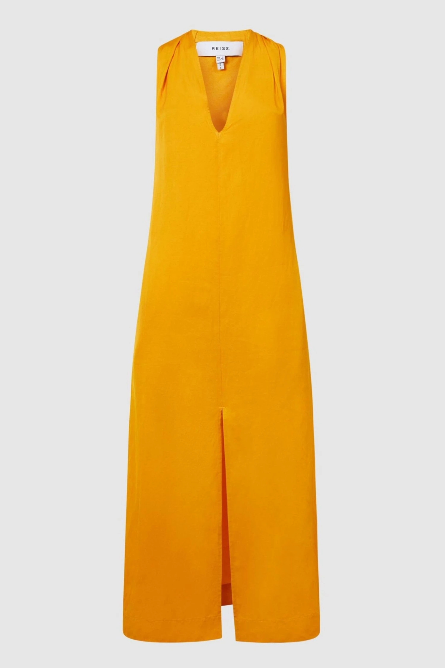 The yellow Alda dress is a special-occasion option that embraces comfort as well as style. It’s cut from a lightweight linen blend into a relaxed fit. A plunge neckline and front slip are added for considered appeal, whilst pockets lend practicality. Complete your edit with heels.