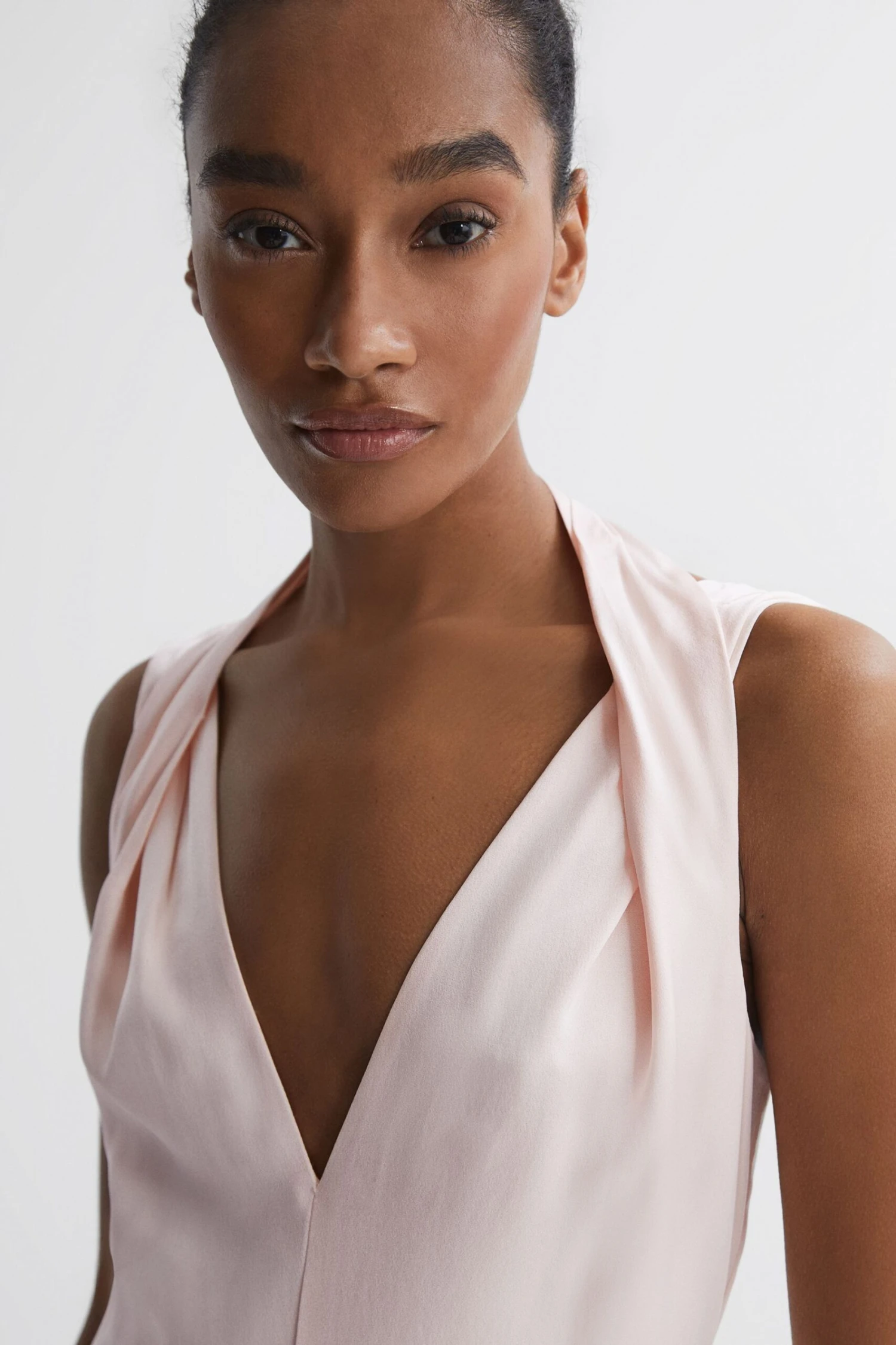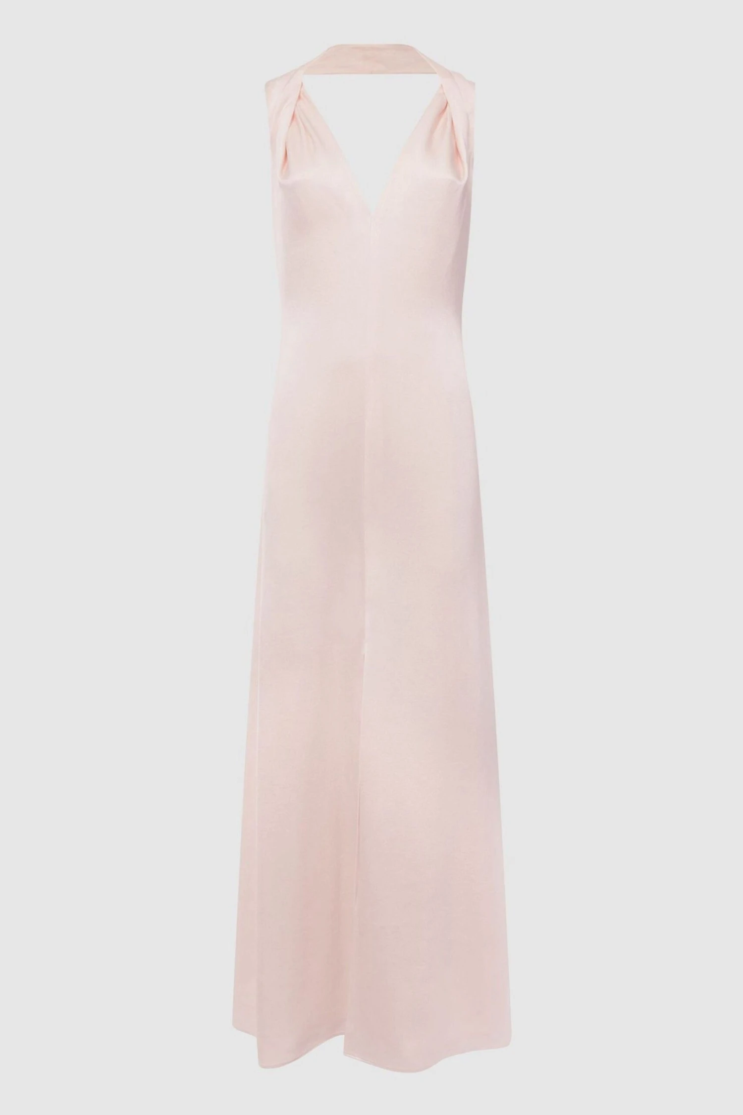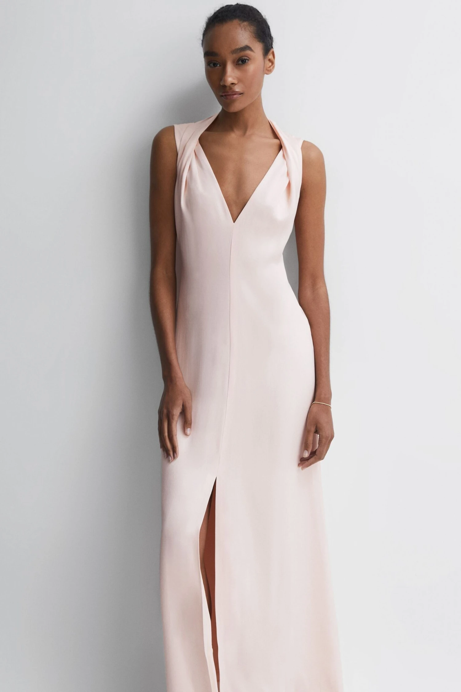 Curate a bridal edit with the nude Lila dress. It’s cut with a deep V-neckline and fitted with wrapped shoulder straps for subtle interest. Its shape skims the frame, sitting narrow on the waist then falling naturally to a midi length. A front slip finishes the look with subtle allure. Accessorise with a neutral clutch bag and heels.