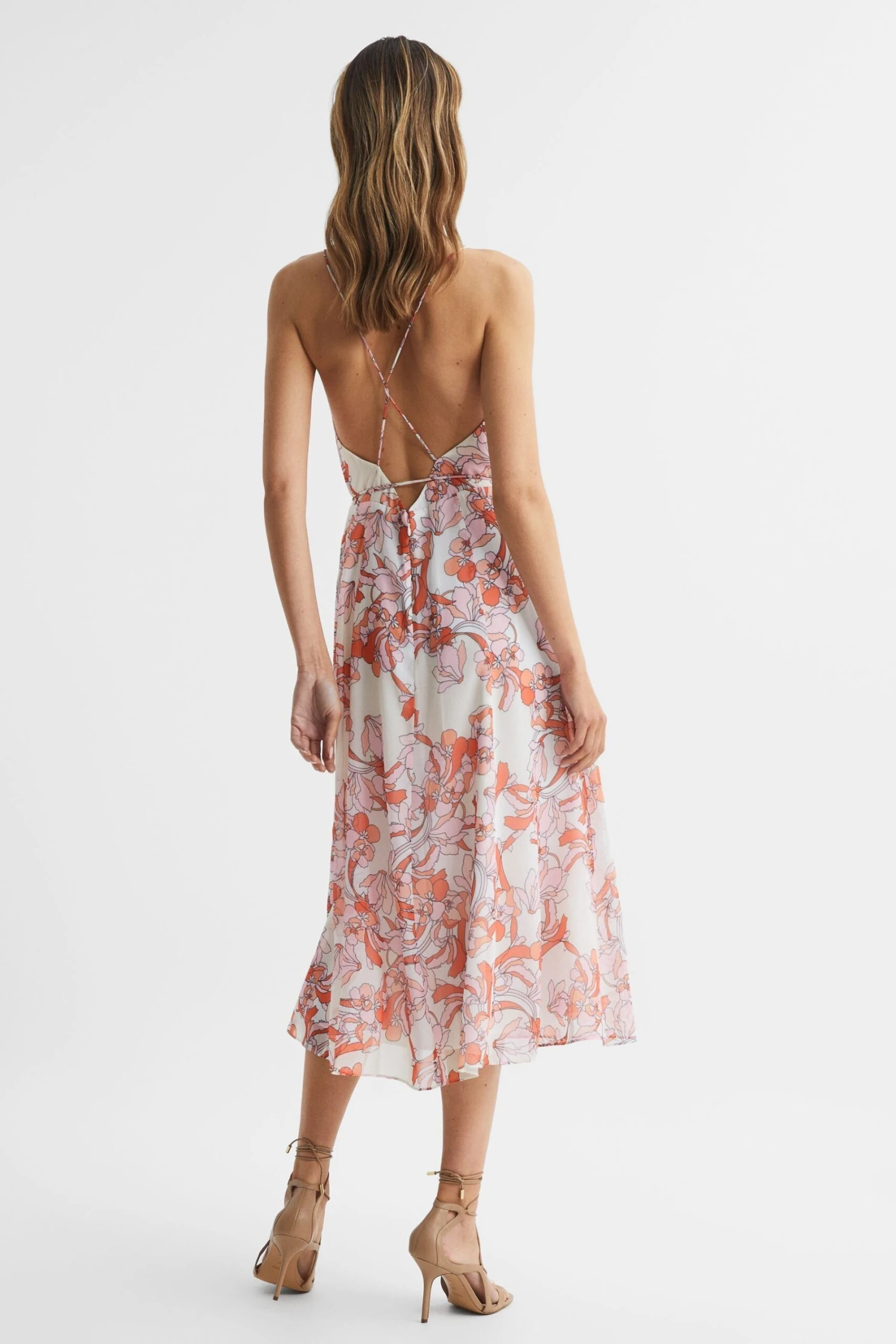 The pale pink Pippa dress is crafted from a lightweight, floral-printed fabrication. It’s cut with a deep V-neckline and fitted with thin shoulder straps that cross over the back for an elegant look. A belted waist cinches the silhouette, and it flows naturally into a midi length. Pair with high heels for a feminine edit.