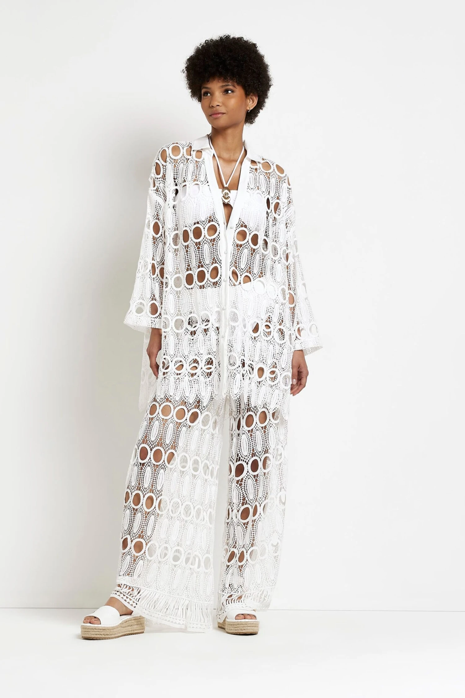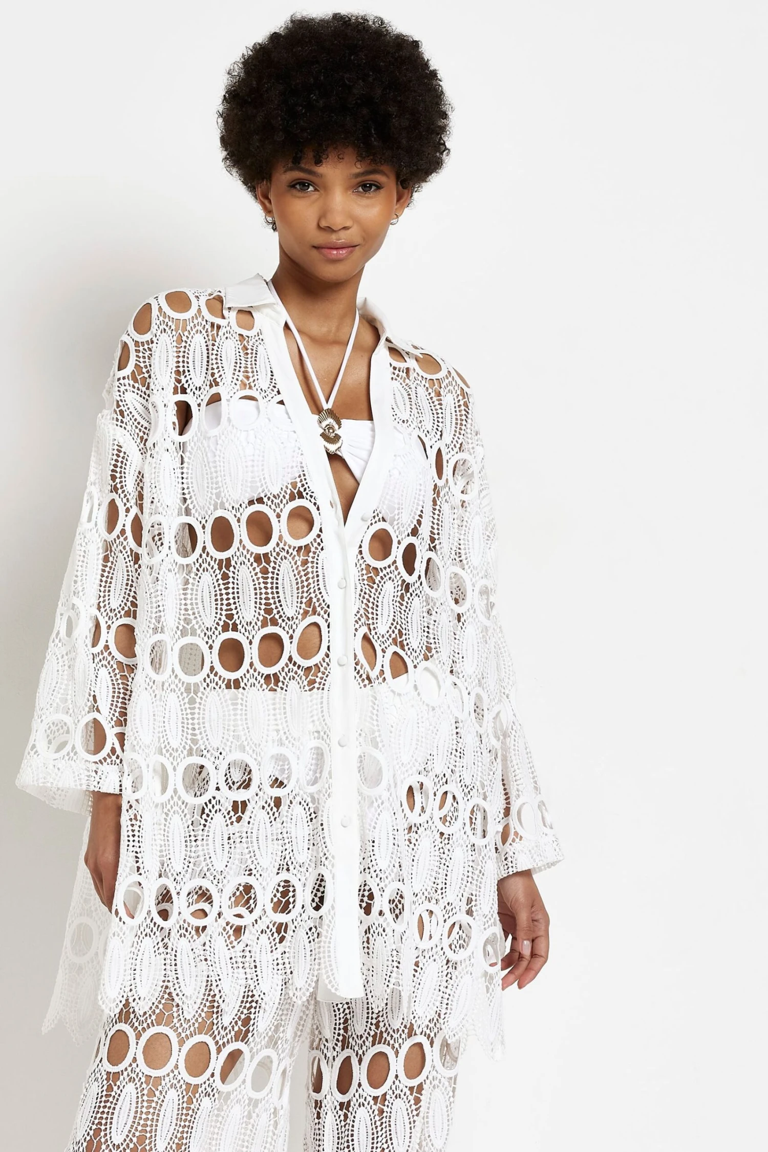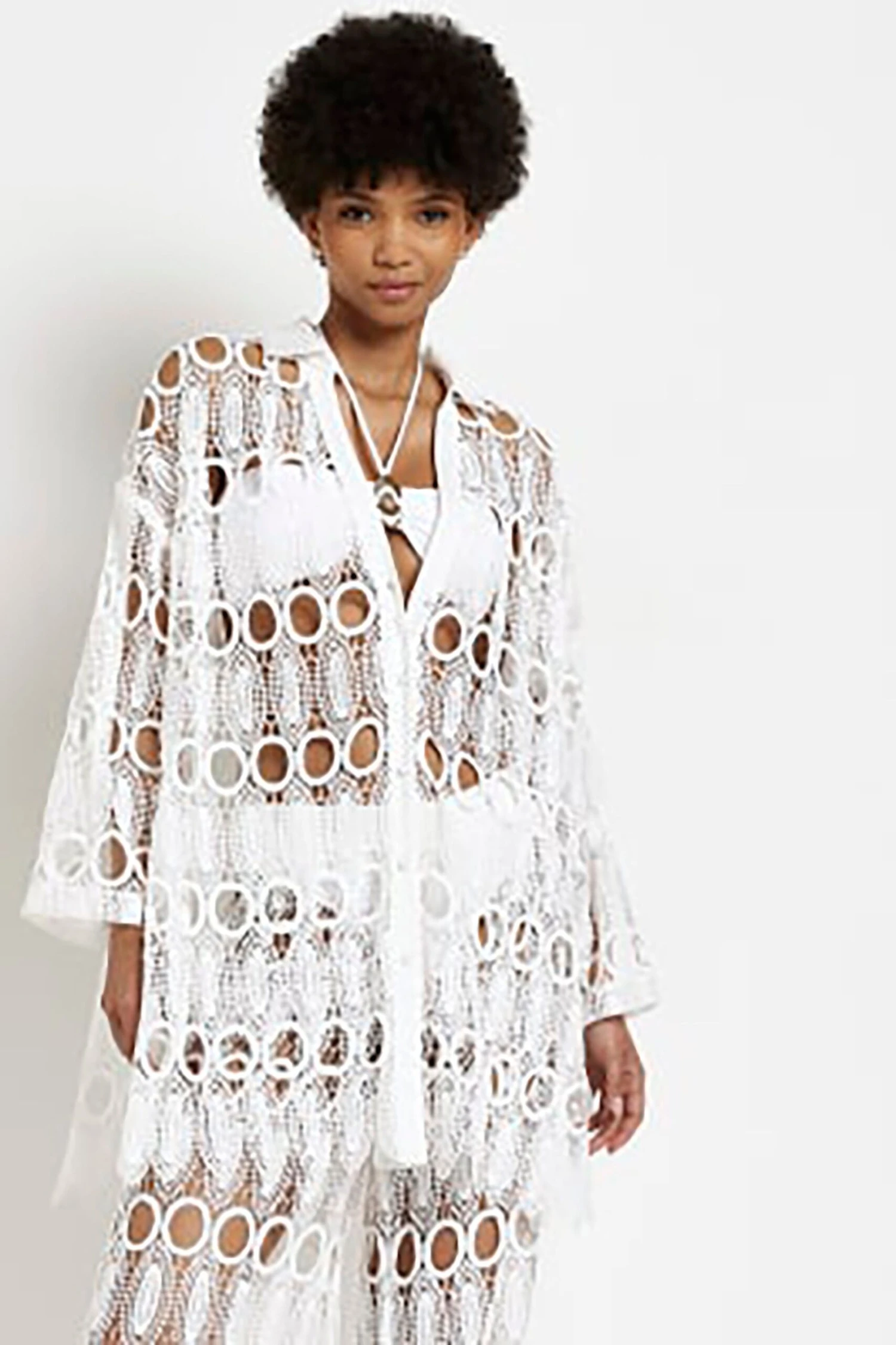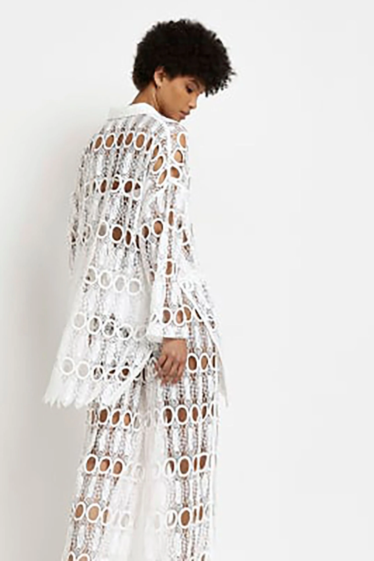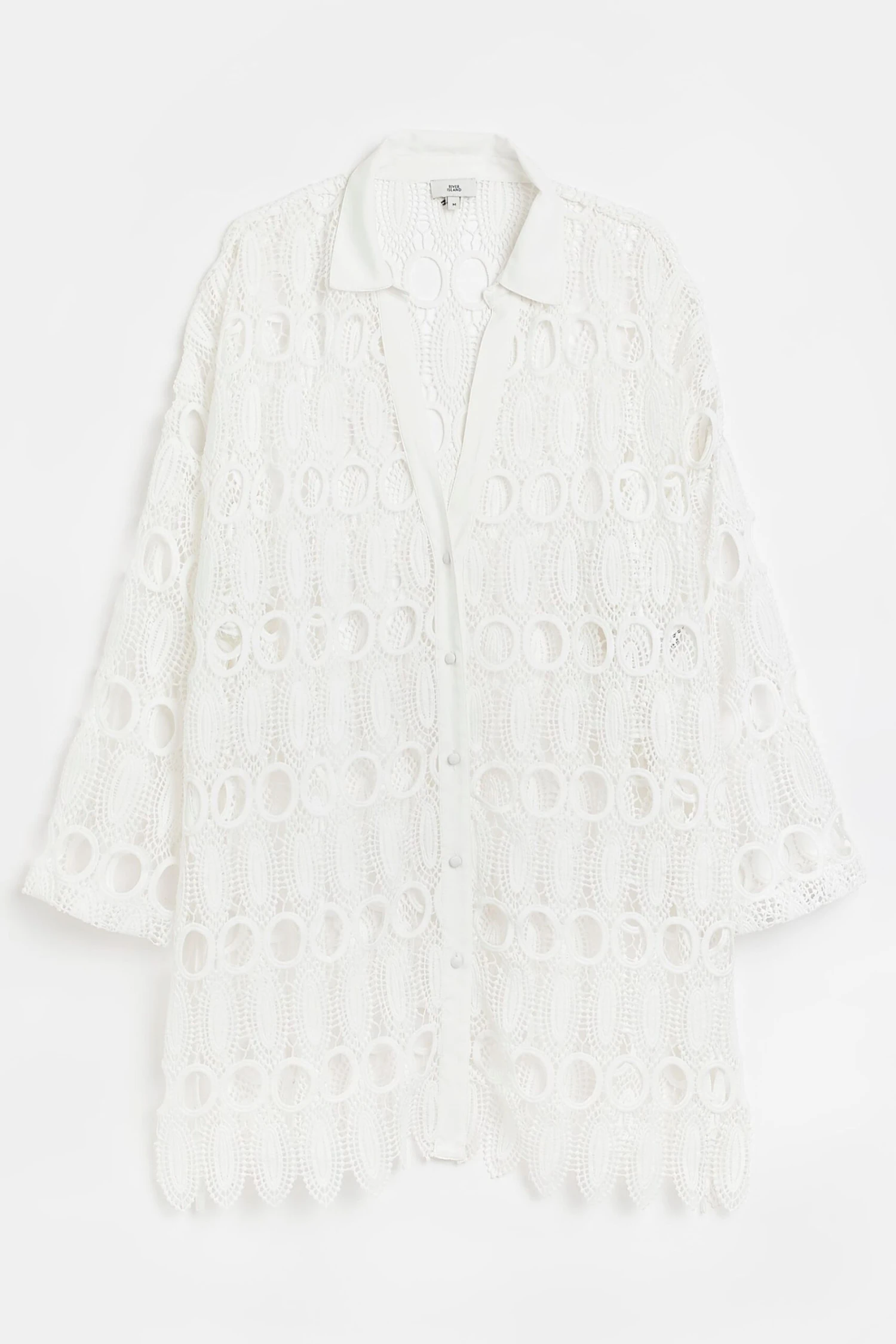 Lace fabric. Oversized fit. Button front fastening. Long flute sleeves. Collar.