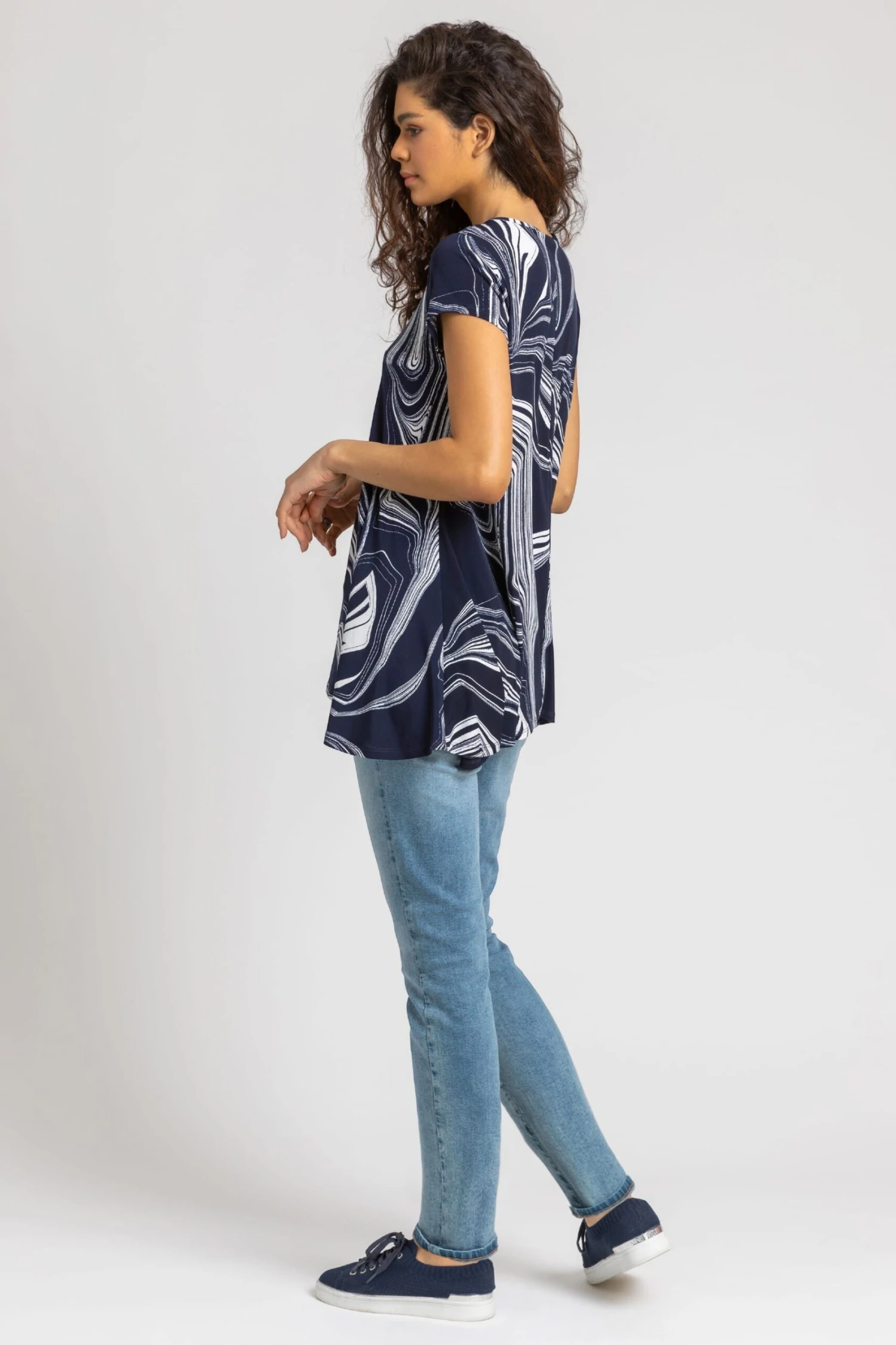 Get wavy! This fun printed take on a favourite Roman design is a wardrobe winner for the coming season. Cut to a longline fit and classic swing shape, this short sleeve tee has a round neckline and an all-over swirled abstract print. Add to your everyday looks with casual denim jeans and pumps for an effortless look.