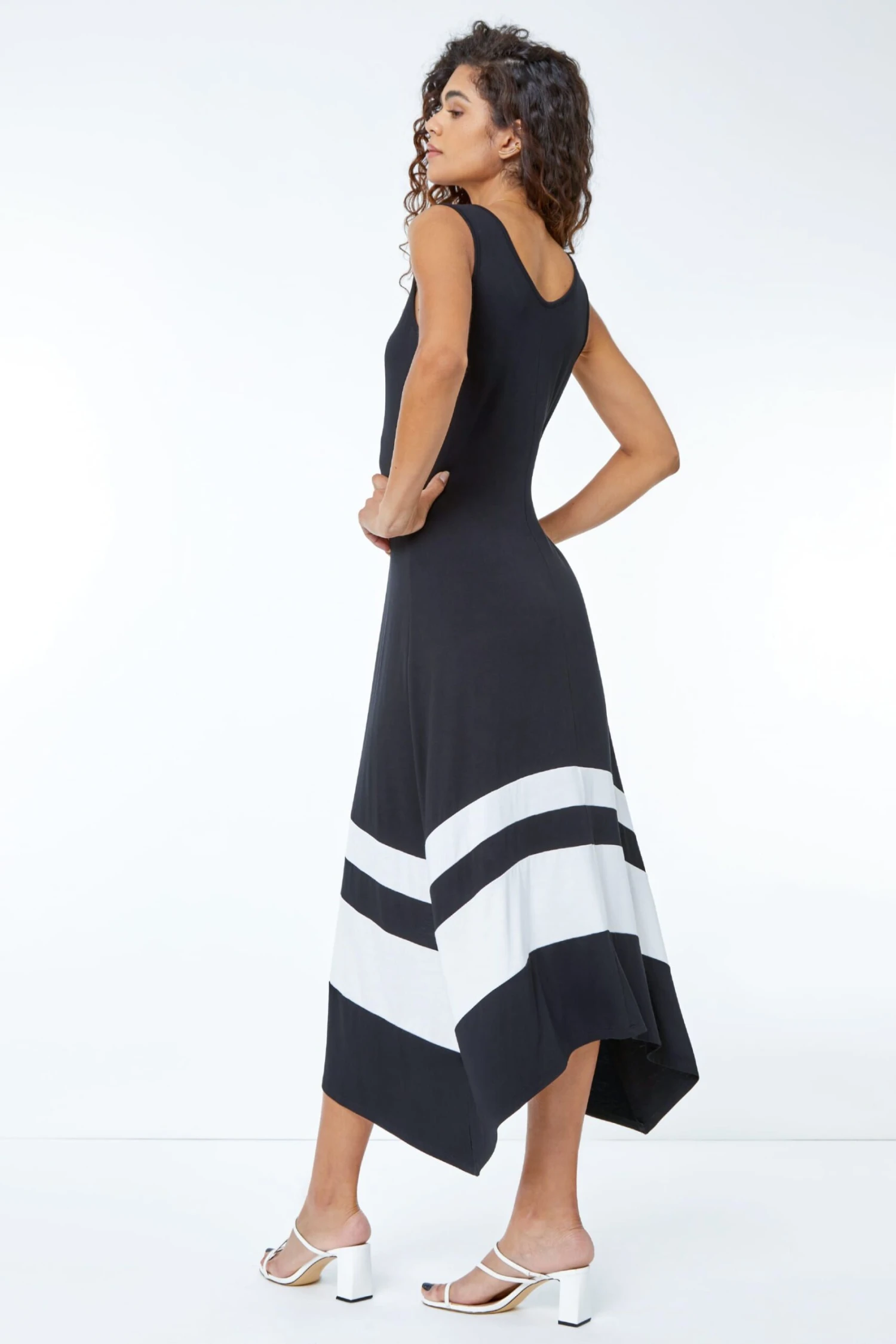 No need to break the bank to look good in this border print dress. Cut from a stretch jersey material this dress offers a round neck and sleeveless arms, finished with an asymmetric hemline this midi number is everything you could want for the summer season. Can be styled up with heels or down with some sandals and a sun hat.
