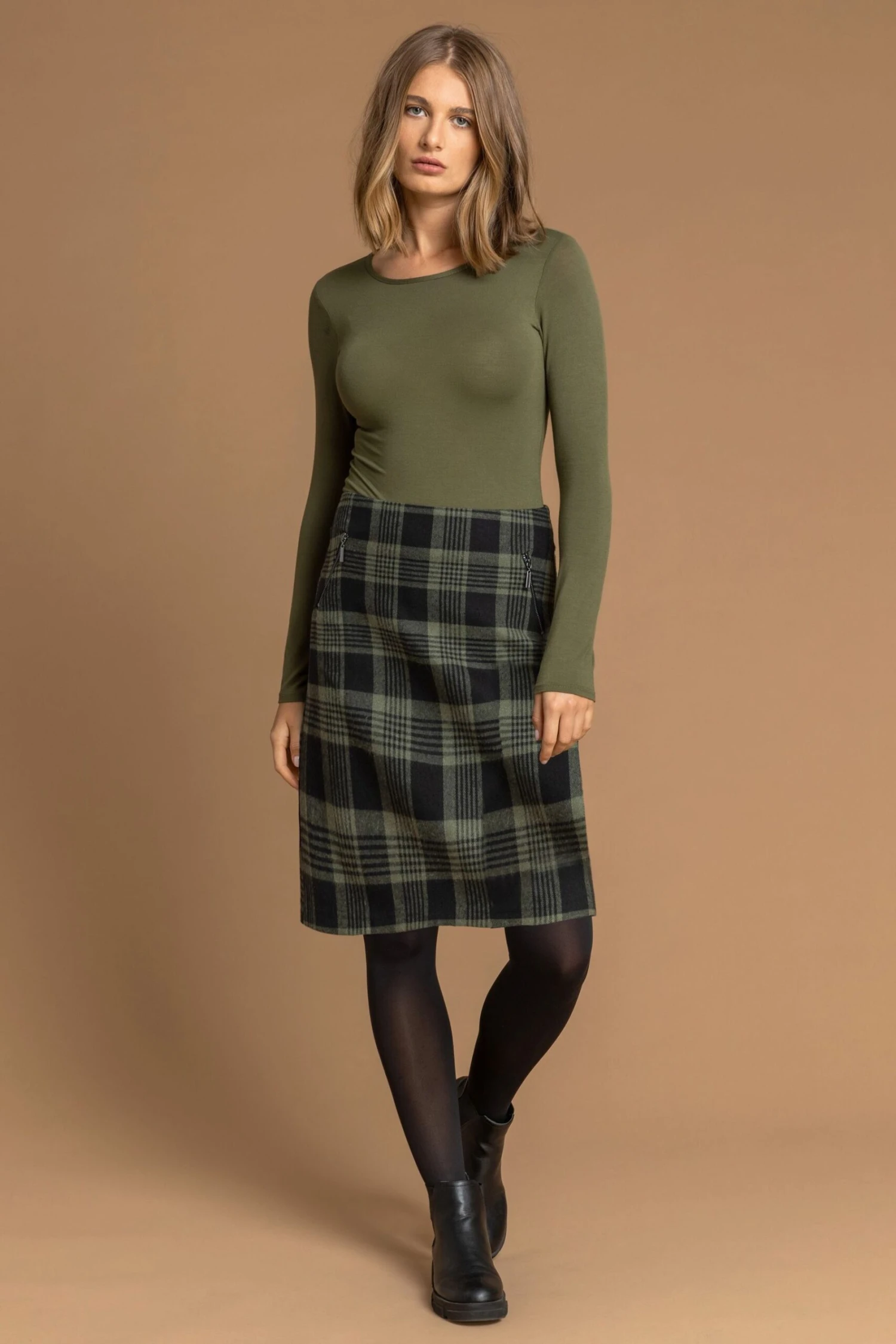 Update your wardrobe staples this season with this check A-Line mini skirt! Crafted with a brushed jersey fabric, this skirt is fully lined and features silver zip pocket details. The ideal workwear piece, this style is effortlessly elegant. Add black tights and heels for a workwear look, or dress down with boots for a relaxed Autumn vibe.