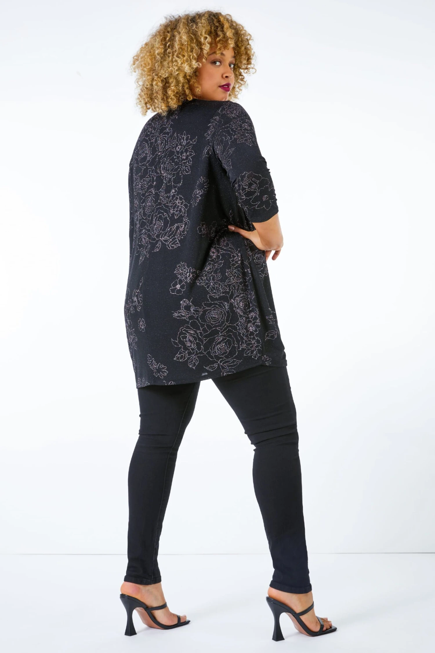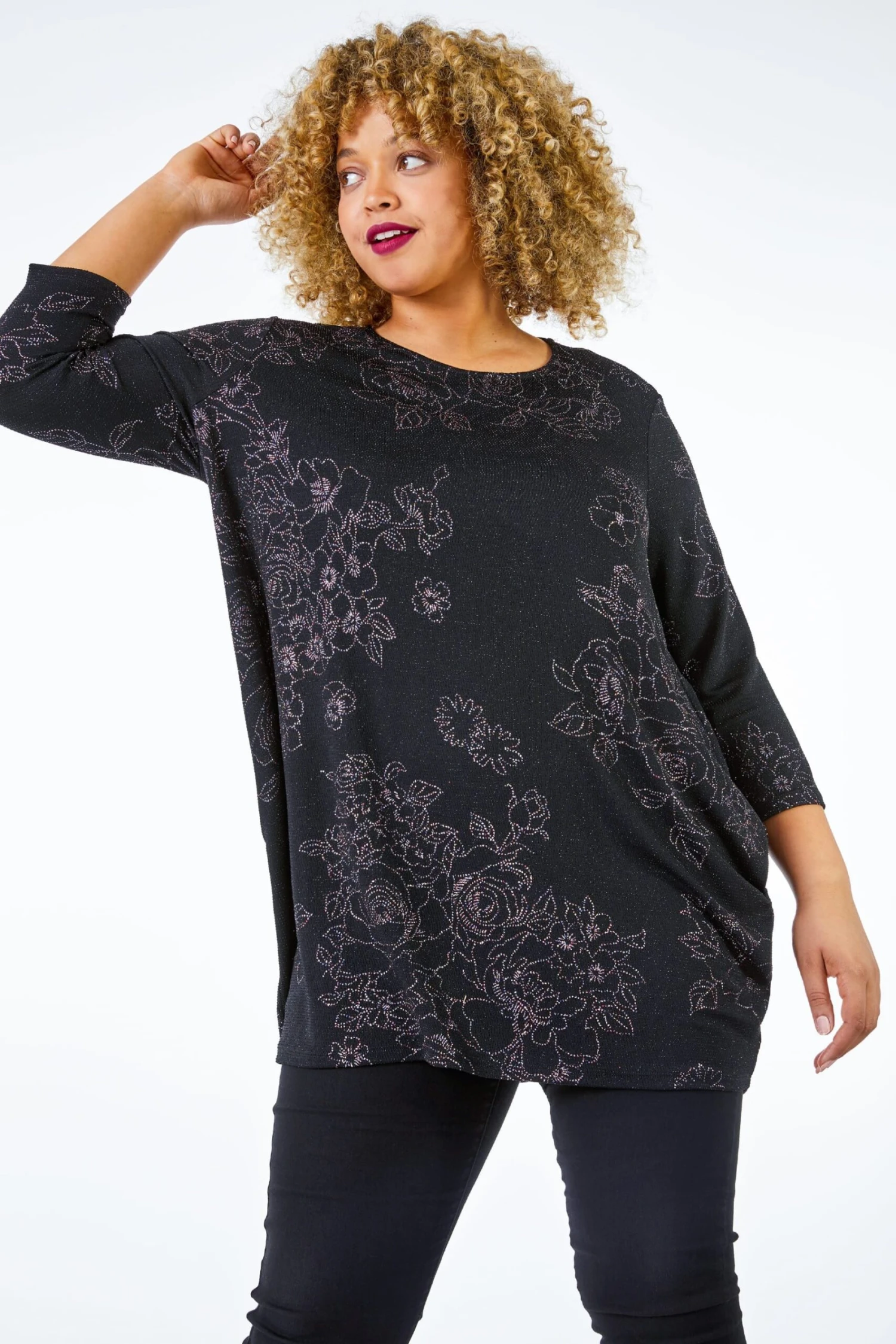 A sparkling take on a classic style, sparkly floral print top is the perfect piece to add to your party wardrobe. This simple yet stunning piece adorned with a shimmer floral print and 3/4 length sleeves. This timeless pop on top will transition effortlessly from day to night occasion, paired with denim jeans and shoes for a day look, or style it with faux leather leggings and a clutch for a night out look in seconds.