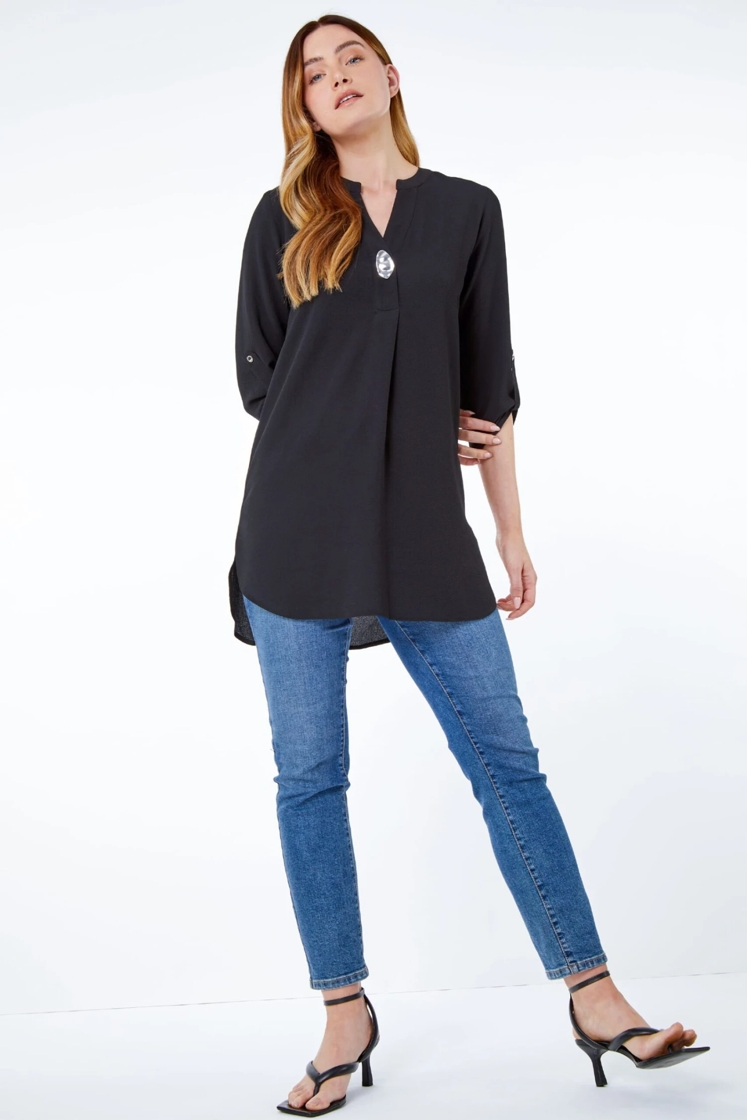 Elevate your work style with this longline over shirt. Crafted from a woven, stretch fabric this piece is both comfortable and cool. It features a smart notch neckline and 3/4 length tabbed sleeves. A metallic feature button finishes the piece perfectly. Wear with smart separates for work or add leather look trousers and heels for dinner and drinks!