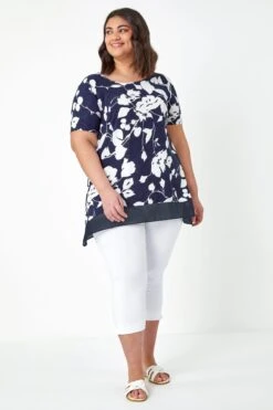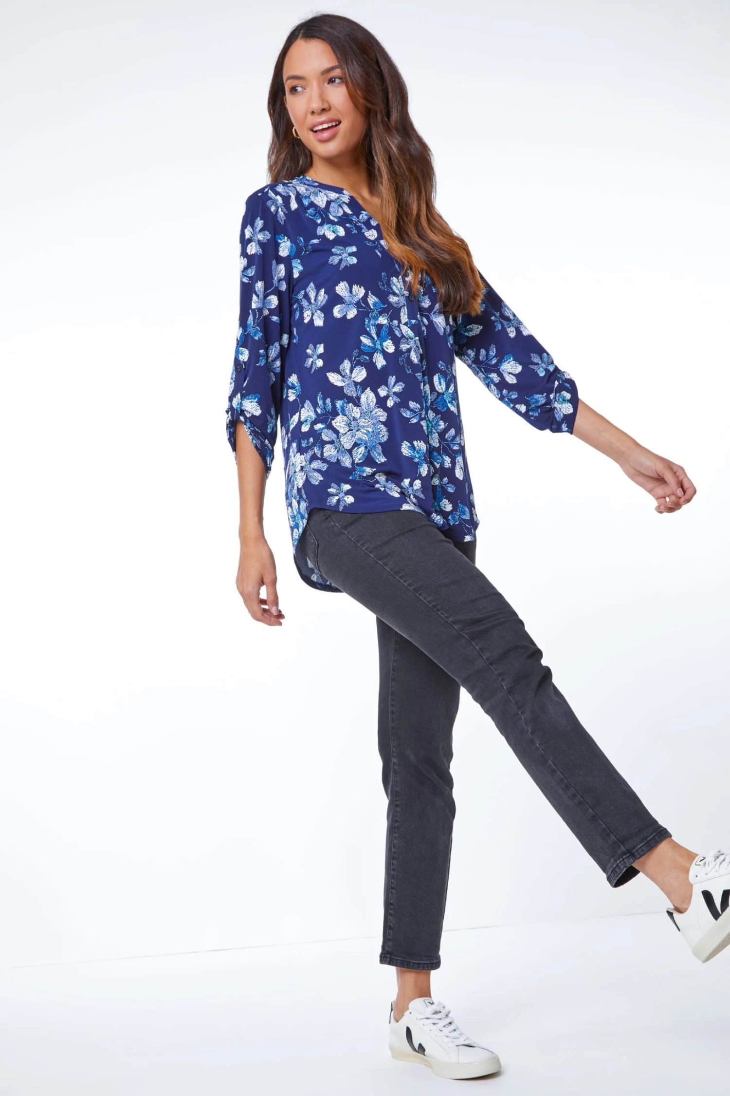 Sophisticated and chic, this floral print blouse is the perfect addition to your wardrobe. Made in a stretchy textured puff print jersey fabric with a notch v-neckline, shoulder pleats and button-up 3/4 length tab sleeves, this timeless shirt is ideal paired with jeans for the weekend or smart trousers for a stylish work look.