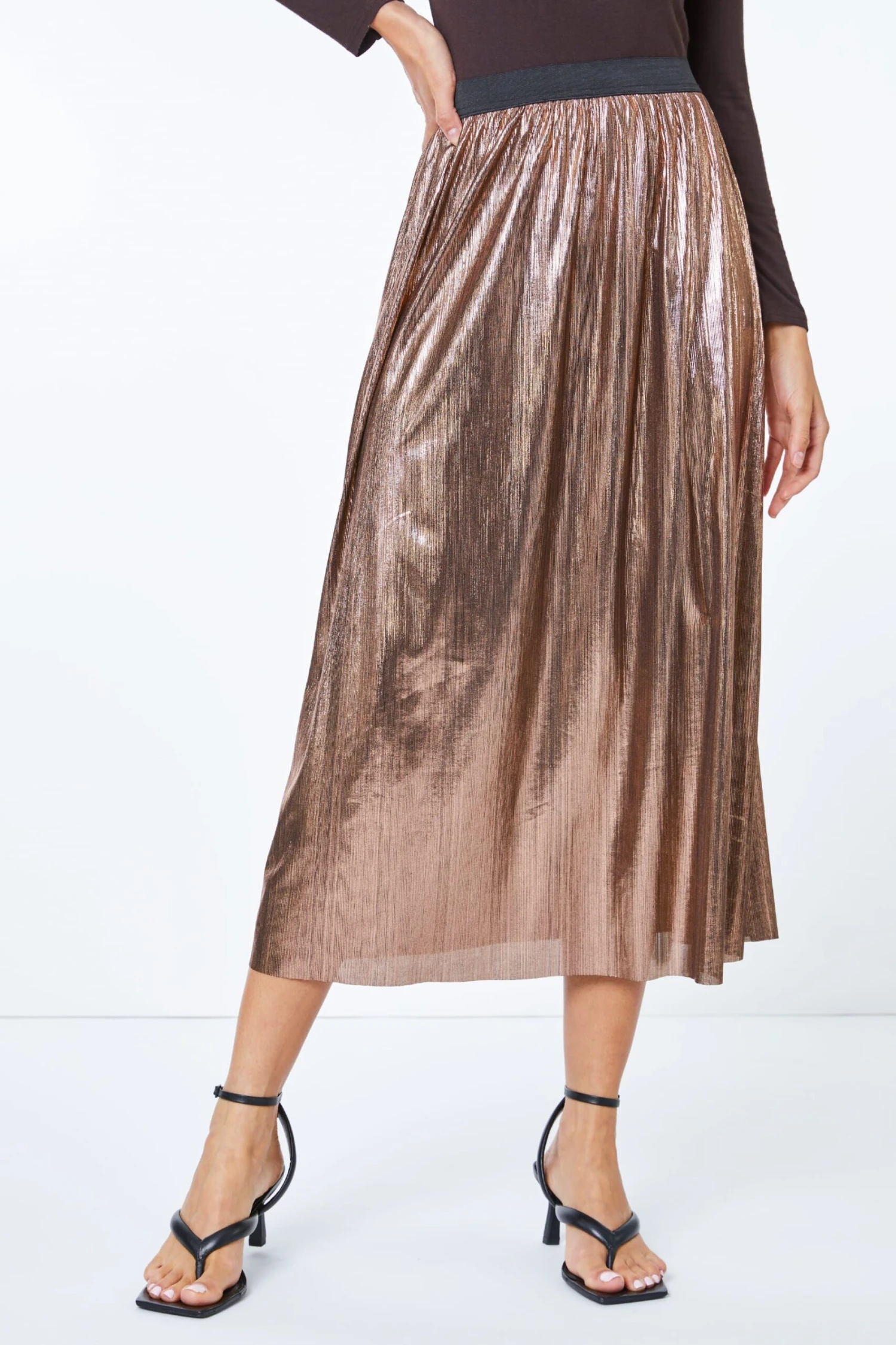 Swish into the new season with this soft pleated, metallic skirt. Featuring an on trend metallic colour, cut from a stretch jersey fabric, it falls to a flattering midi length. A comfortable fit is guaranteed with an elasticated waistband. Dress up with a cami and heels or down with knitwear and trainers.