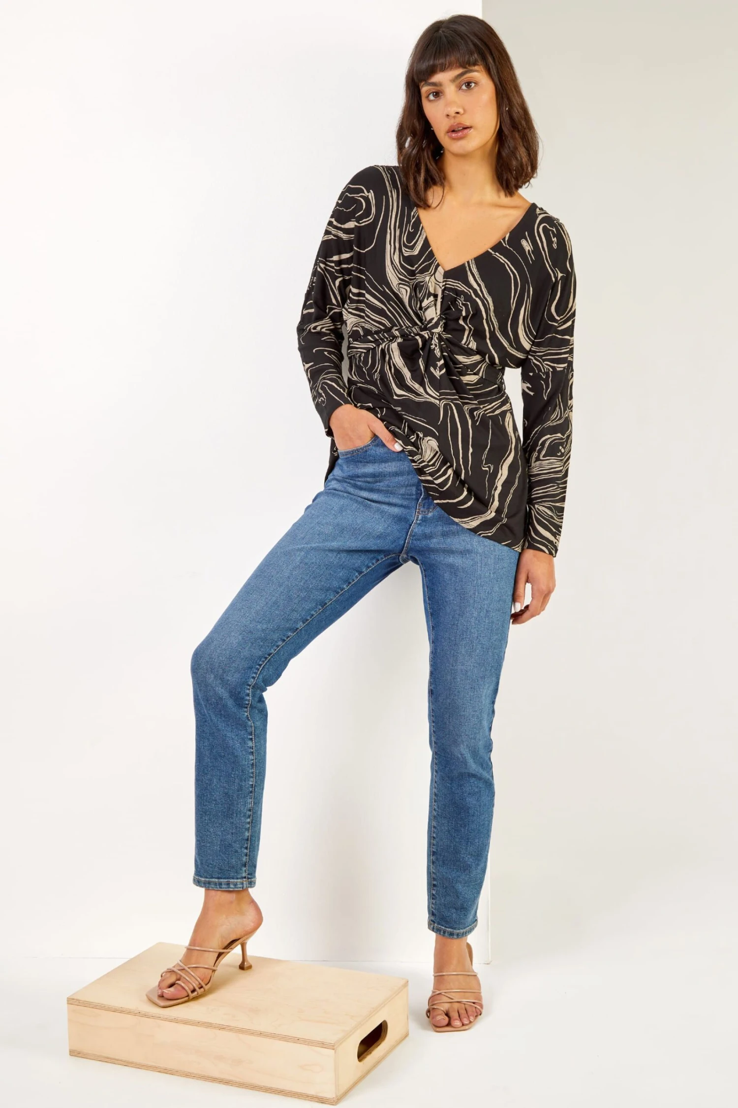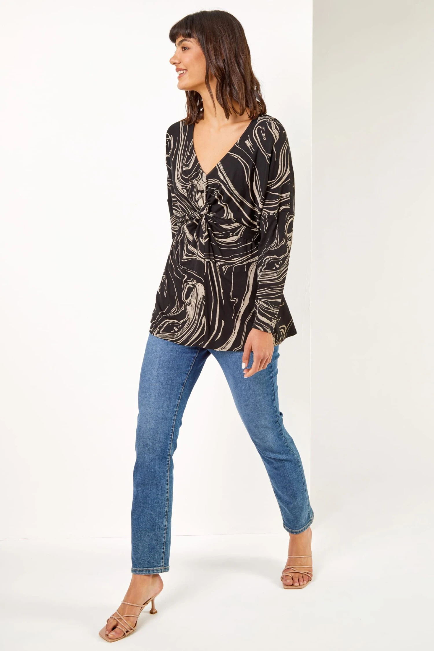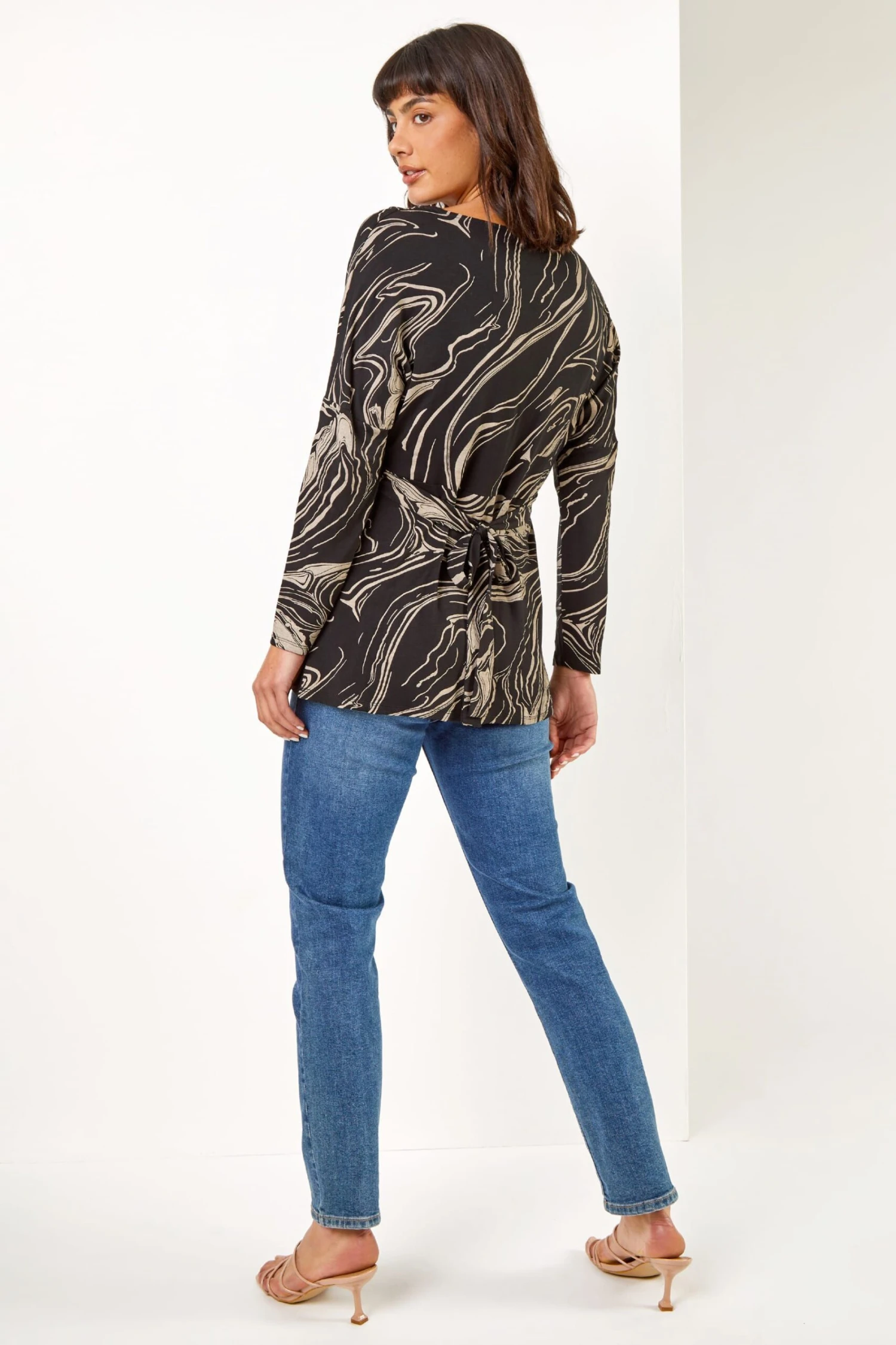 Take your pretty prints through to the cooler months with this swirl print tie top. Crafted from a soft, jersey material this easy to pull on style has a flattering v-neckline and long sleeves. Its tie detail at the waist provides a flattering shape, which you can adjust to suit you. Dress this up with jewellery, faux leather leggings and heels for an evening dinner.