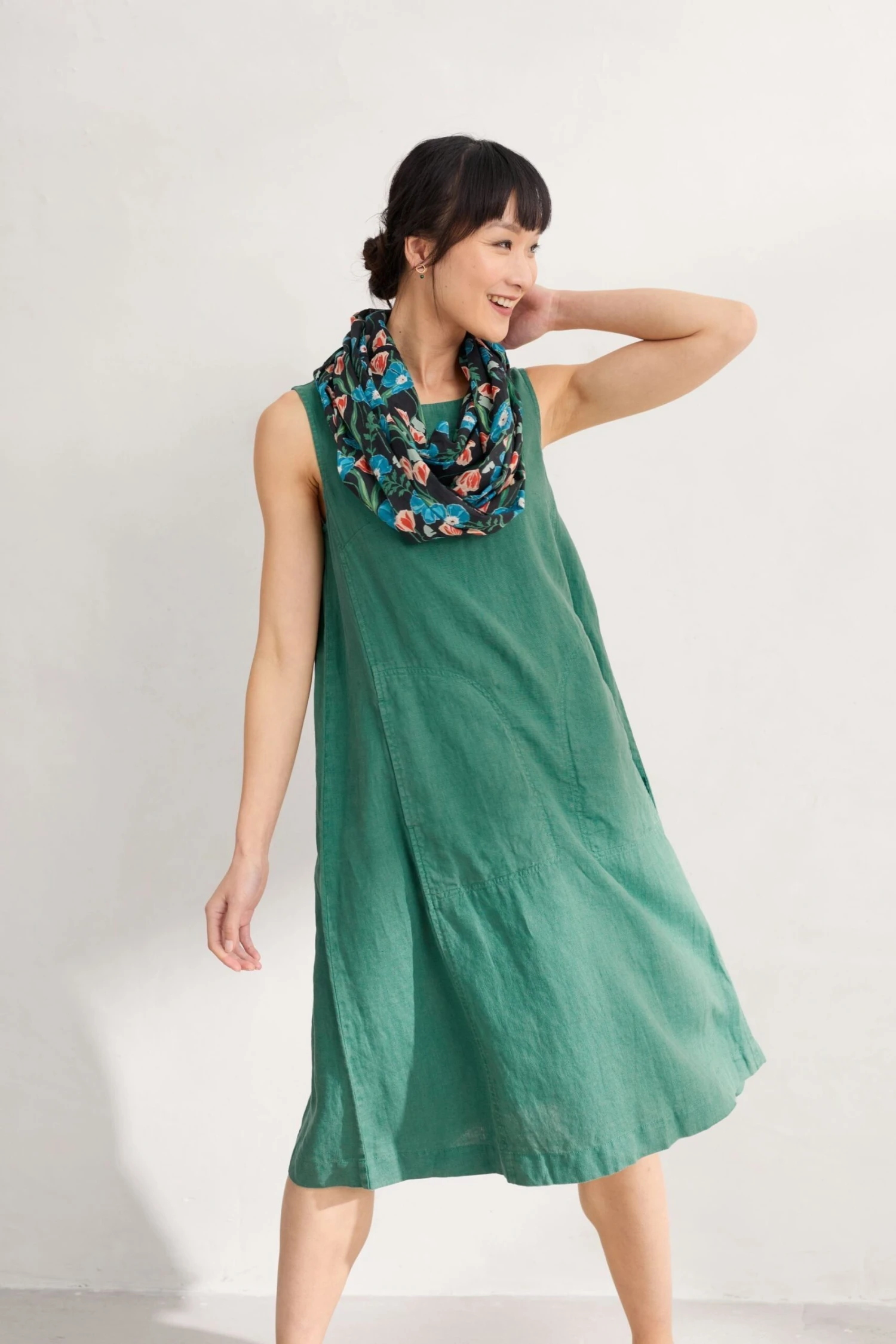 Sleeveless A-line linen dress that falls below the knee, the perfect easy summer style.