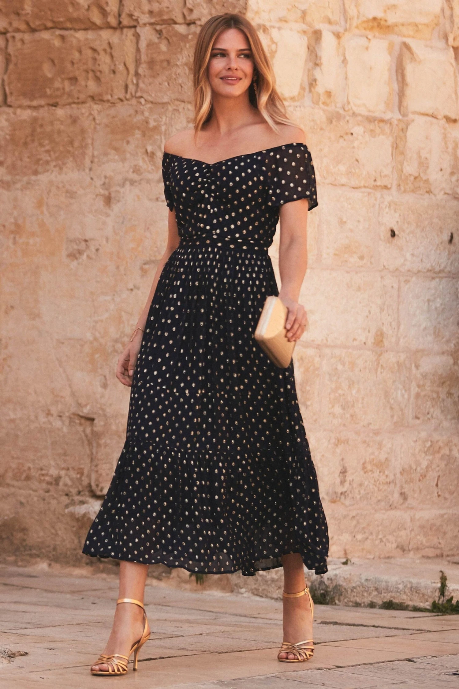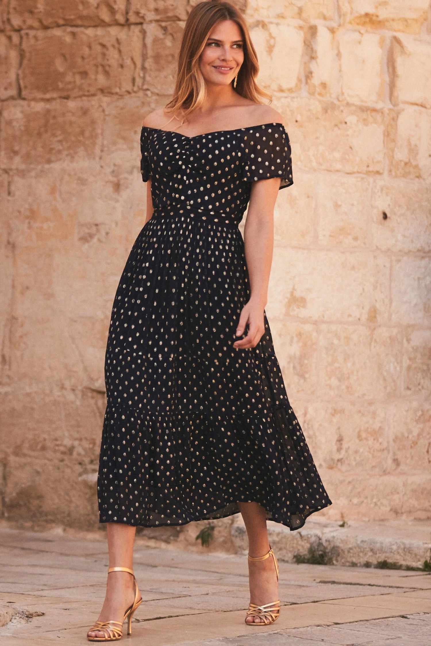 Sosandar Lurex Spot Bardot Midi Dress