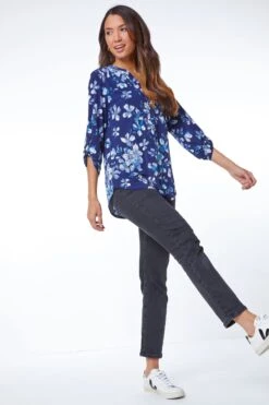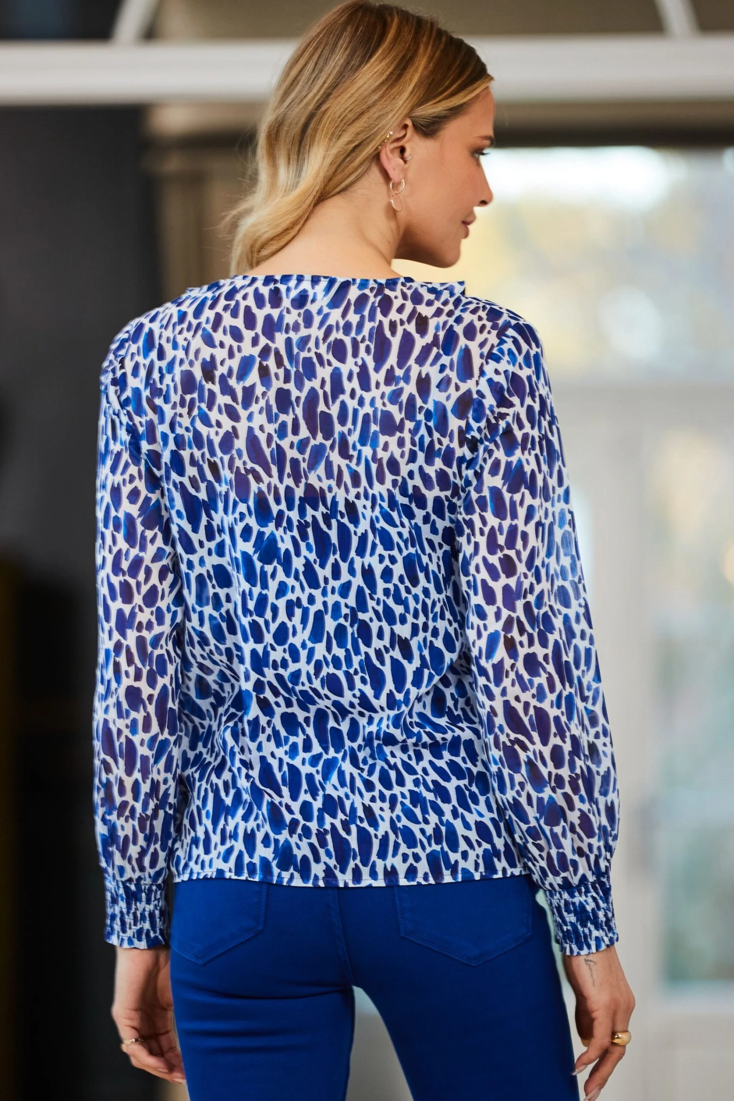 Hello new favourite print, sexy semi-sheer fabric, flattering v-neck with dreamy ruffle trim, cuffed blouson sleeves for a standout silhouette, work smart weekend chic, jeans leather leggings trousers – it ll go with them all. Model is 5 9 and wears a UK size 8.