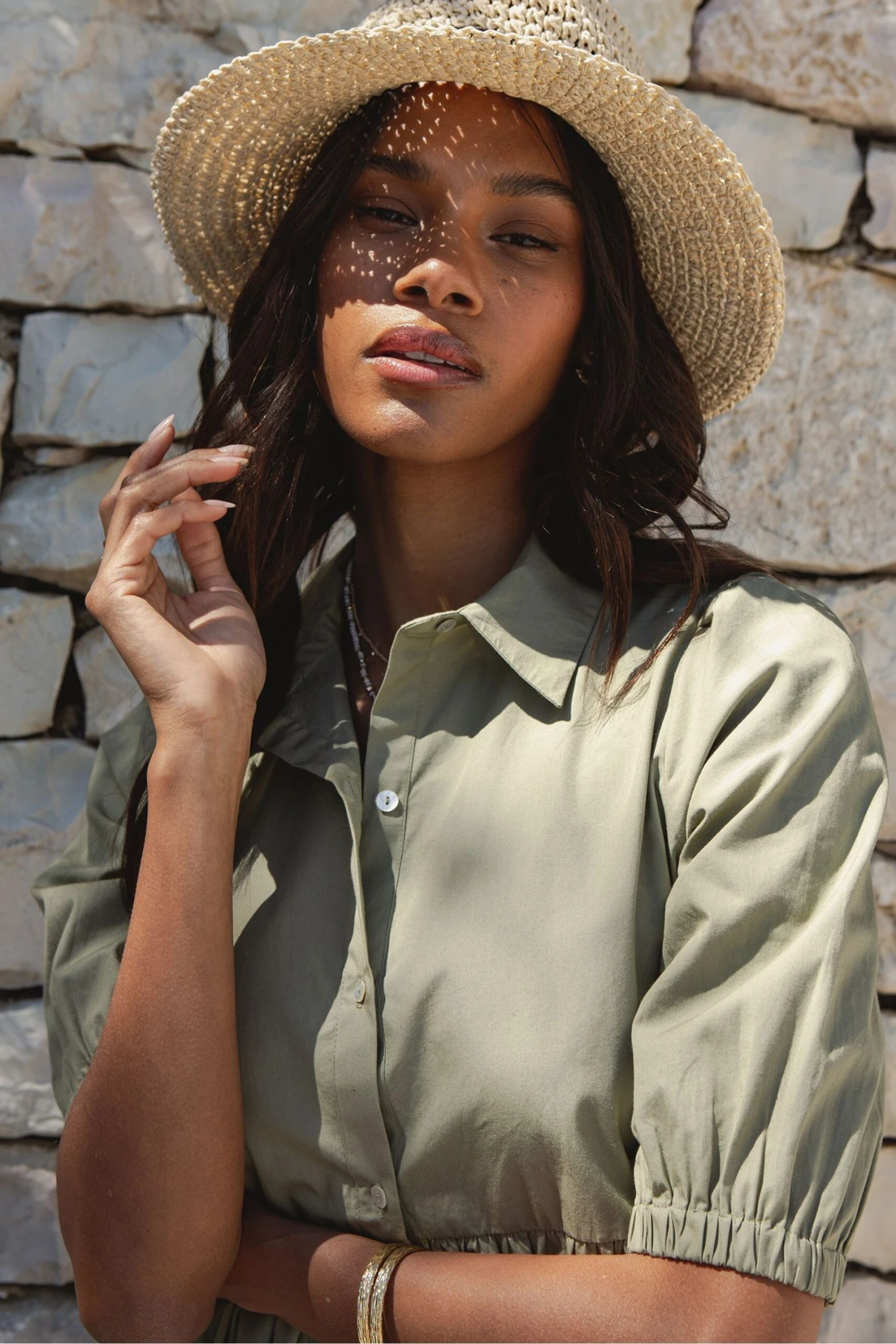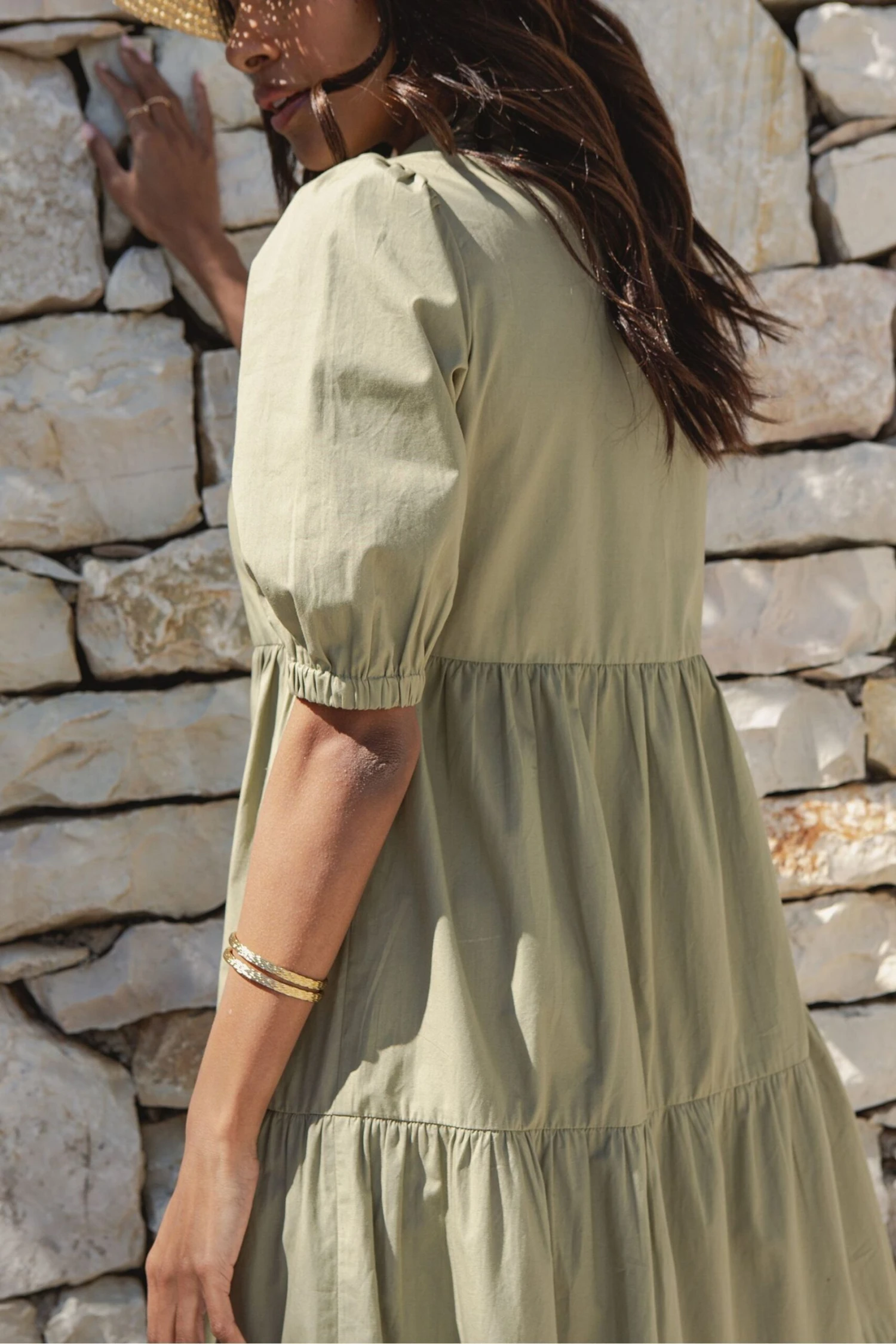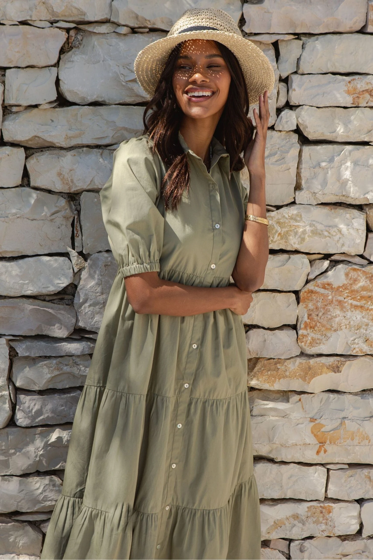 This versatile and understated midi shirt dress from Threadbare is designed for comfort and style. With set-in sleeves, a stand collar, and a functional button placket to the front, this tiered maxi dress has puff sleeves while elasticated cuffs finish the look. Subtle gathers along the waistline provide fullness in the skirt and a wide hem with a tiered design adds movement. This chic dress makes a perfect effortless statement. Model wears UK size 8.