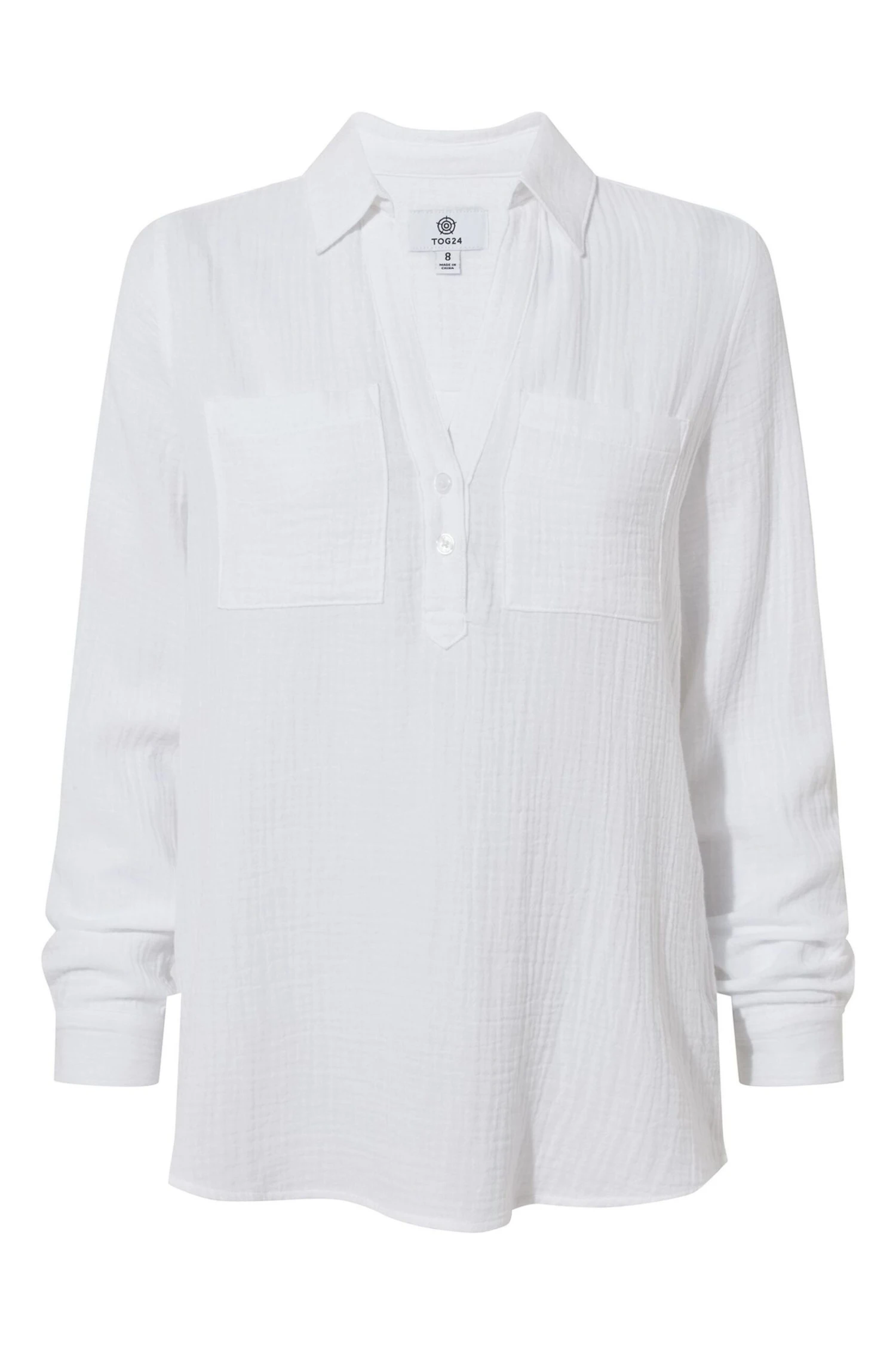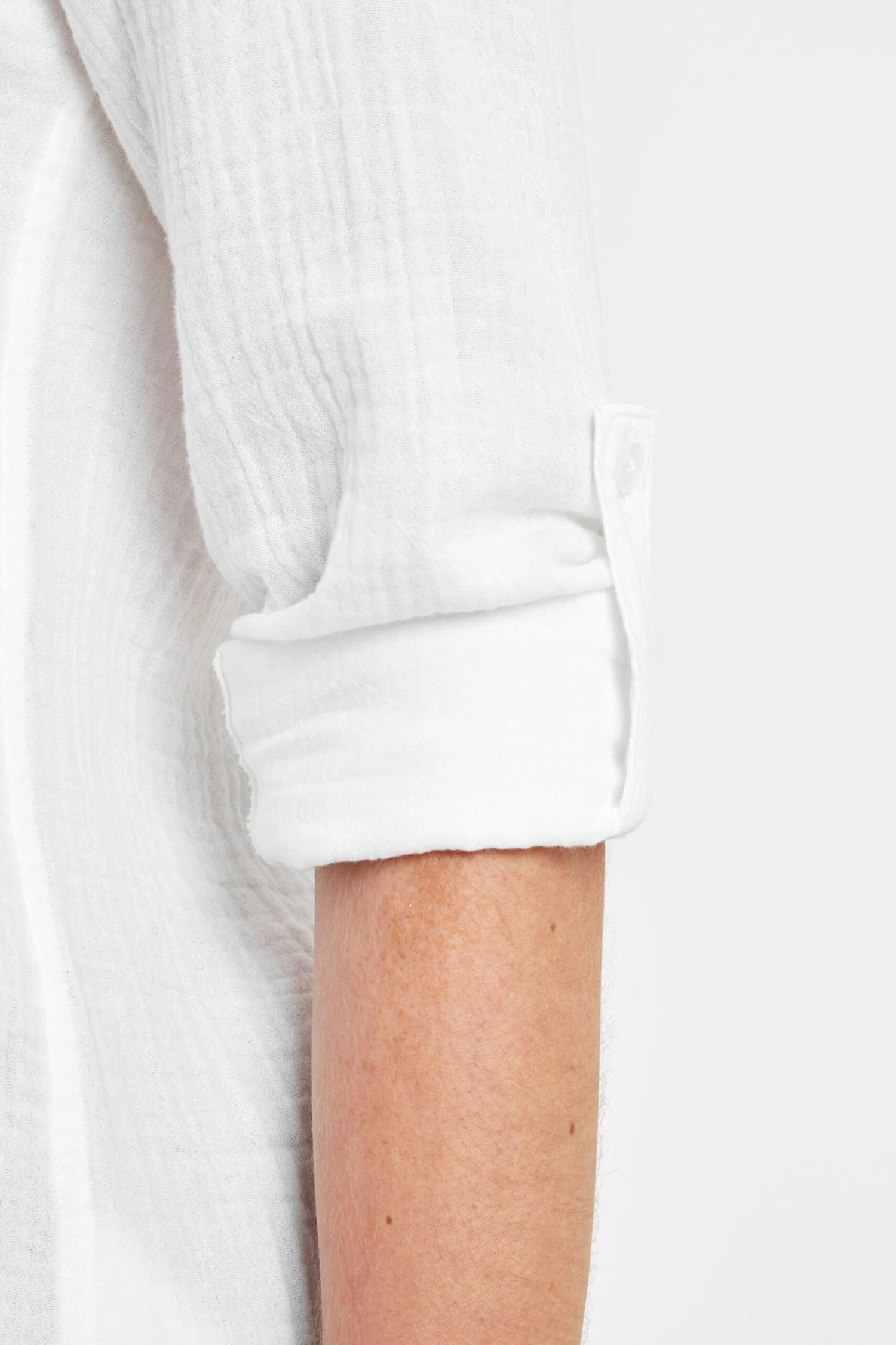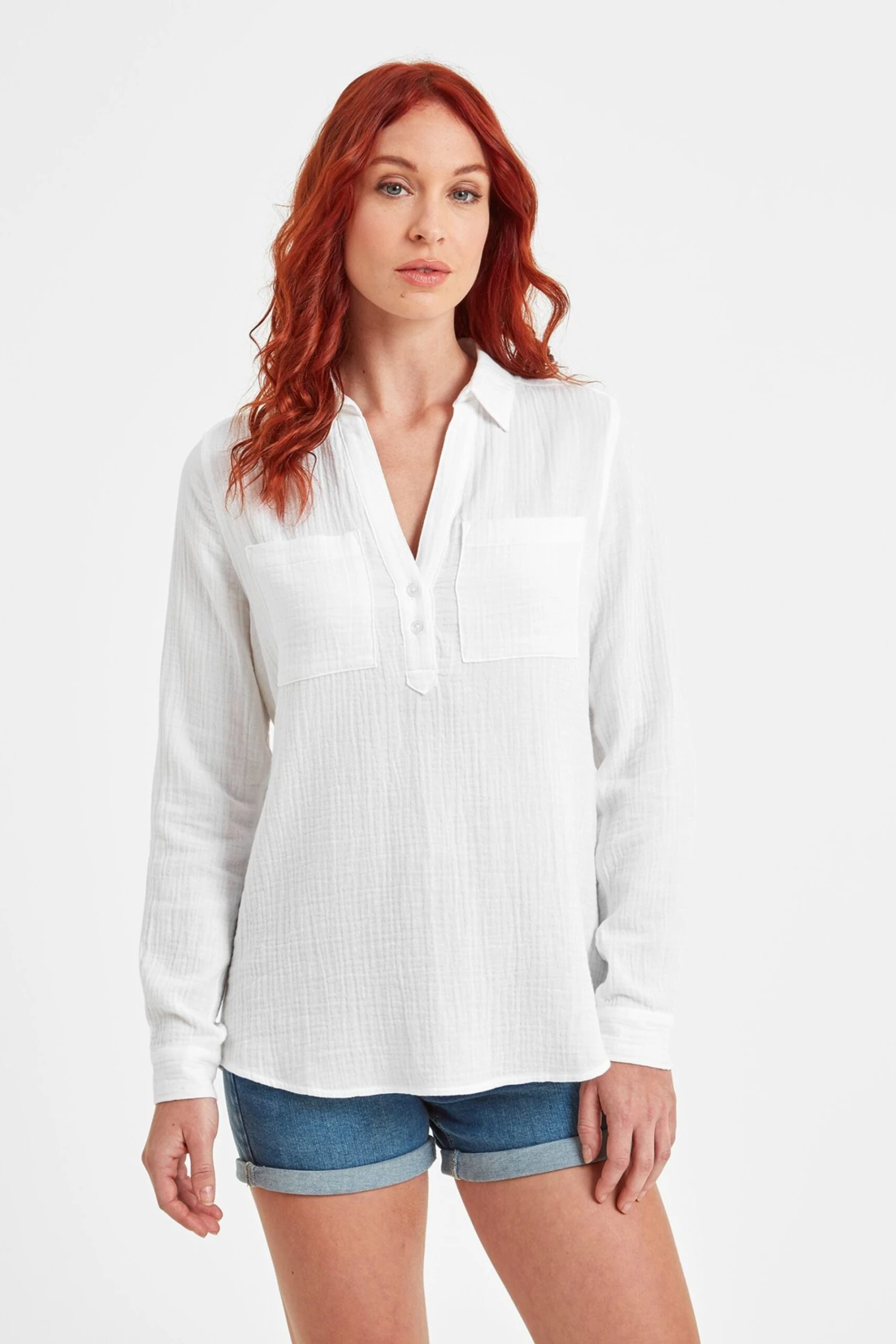 Light and airy, our Summer blouse comes in a textured cotton fabric with a subtle waffle pattern woven in that is supersoft to the touch. The relaxed Y neck, patch pockets on the chest and pleat at the back give this summery shirt a relaxed silhouette and it looks great teamed with shorts, leggings or jeans. Summer has a discreet tab inside the sleeves so you can style this casual shirt your way. Wear the sleeves down when there’s a nip in the air, or roll them up on warmer days and secure them neatly with the tab. Designed by our team in West Yorkshire with every attention paid to detail, you’ll find subtle branding on the fastening front buttons as well as a small, woven label on the side seam as a nod to our ethos of Truth Over Glory.