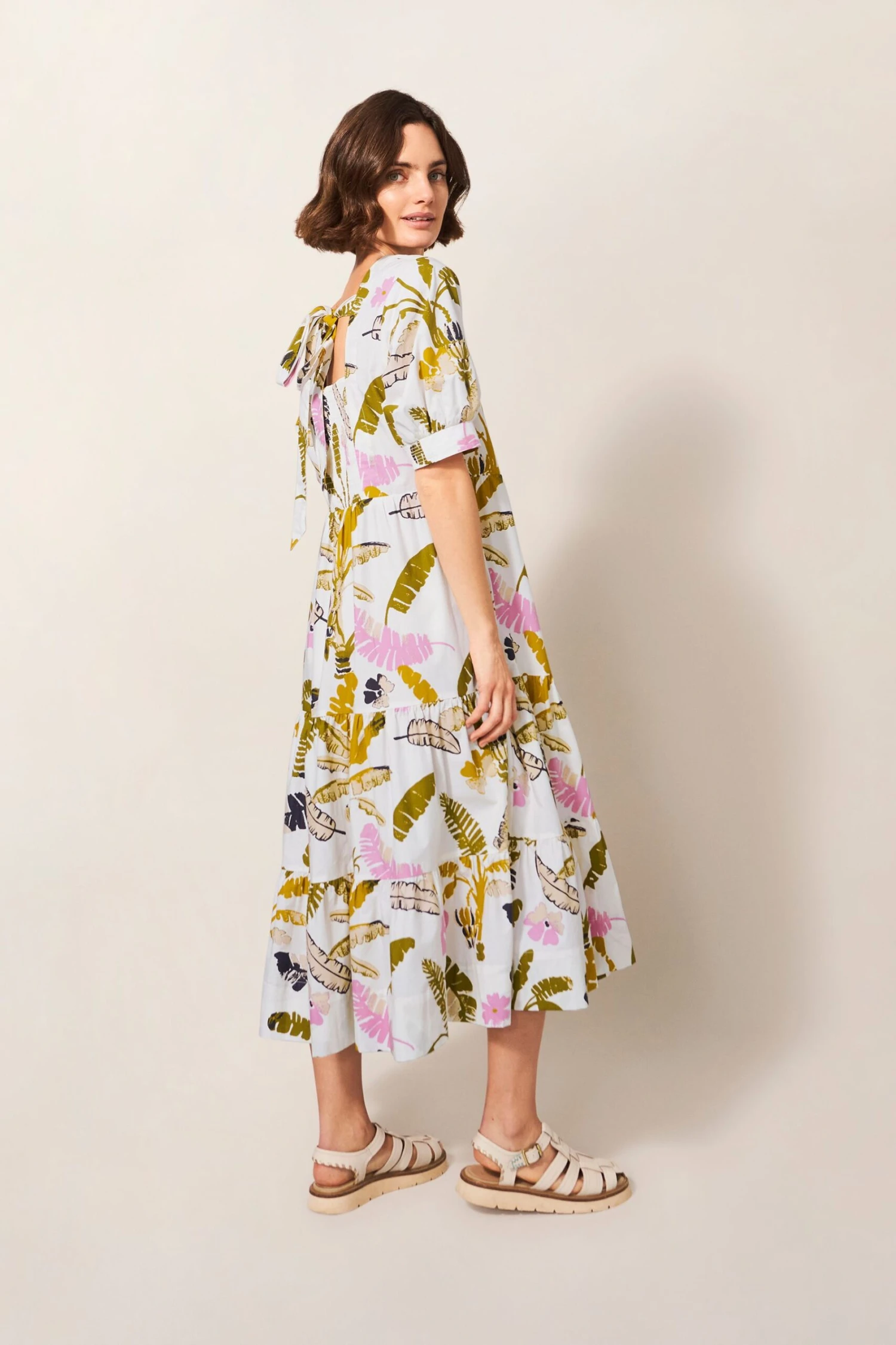 Short sleeve, midi dress with a tie back. All over print.