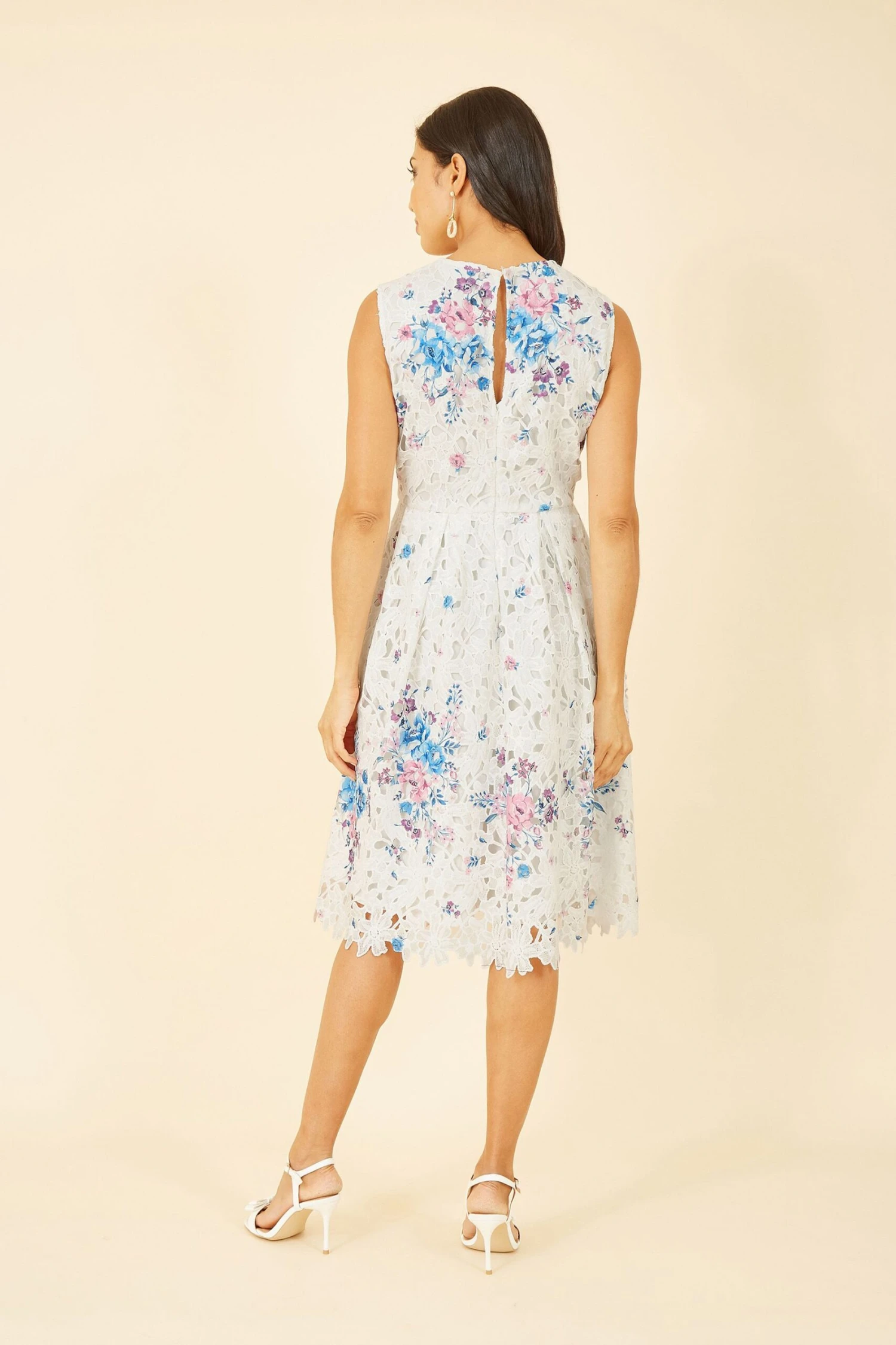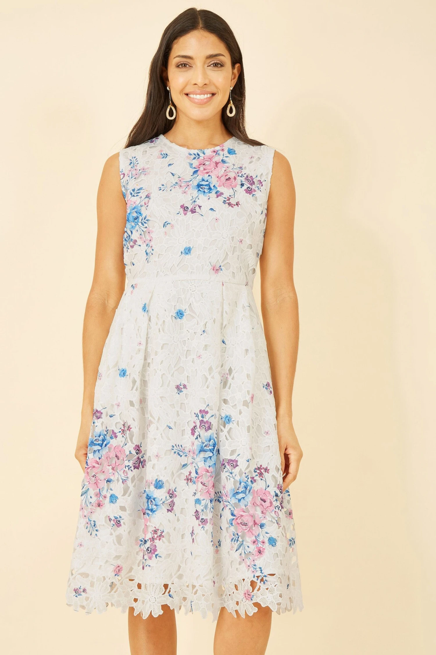 Off to the races? Pair this gorgeous lace number with a fascinator and you re good to go. The lace overlay is printed with a pretty flora. In a classic fit and flare skater style, with round necklines and knee length, this dress fastens in the back with a zipper and button at the neckline.